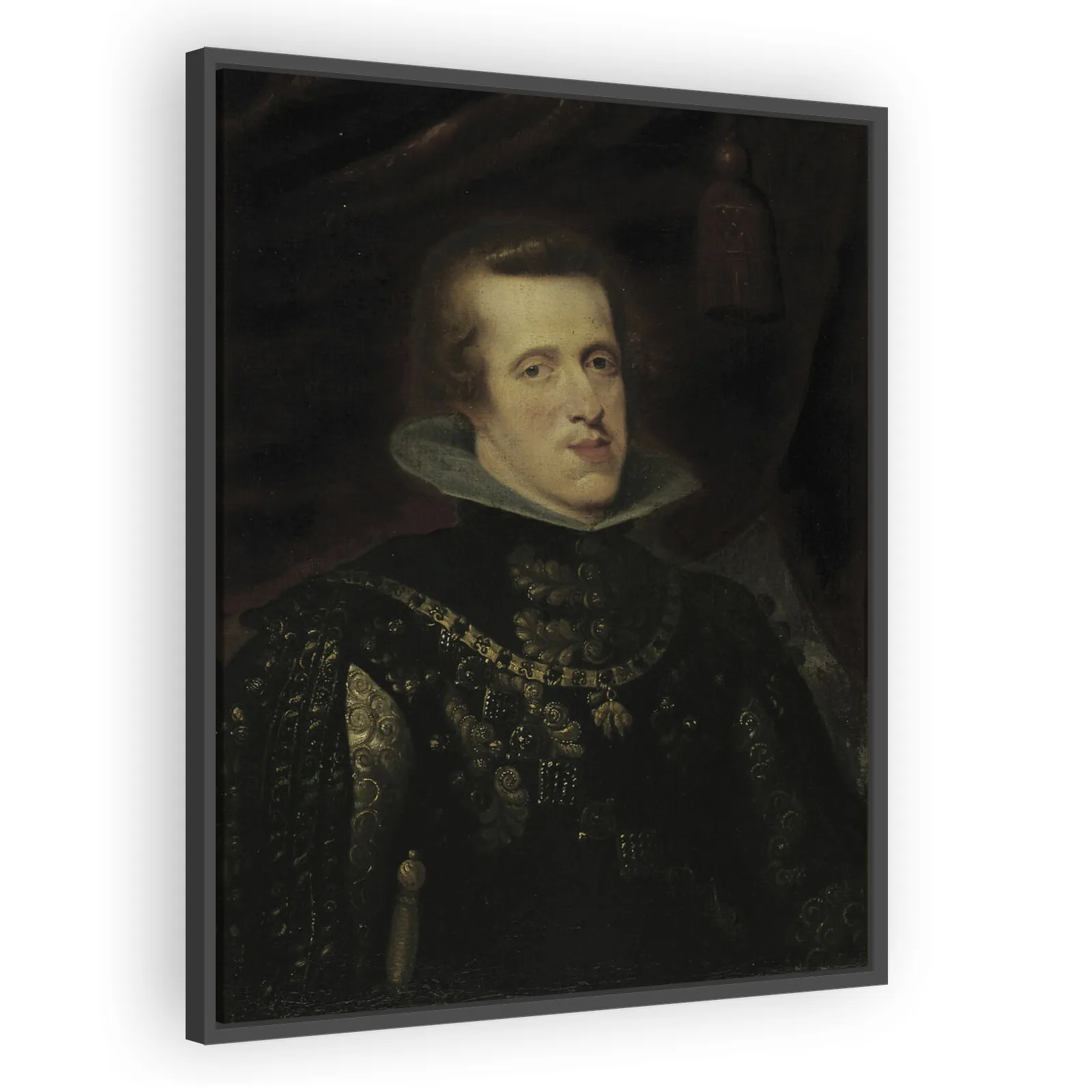 Gedetailleerd 17e‑eeuws portret van Philips IV van Spanje, een Nederlandse kopie naar een compositie van Peter Paul Rubens. Een verfijnde barokke weergave met levendige verftechniek en aristocratische...