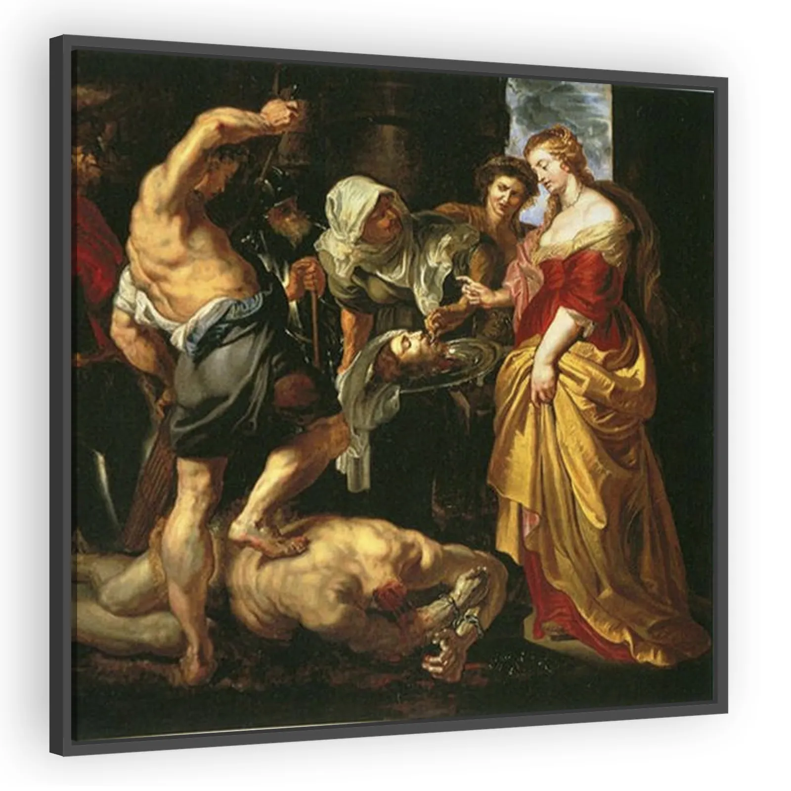 A dramatic 1609 depiction by Peter Paul Rubens of the biblical episode of John the Baptist’s beheading. Rubens employs Baroque intensity—dynamic composition, bold contrasts, and charged emotion—to por...