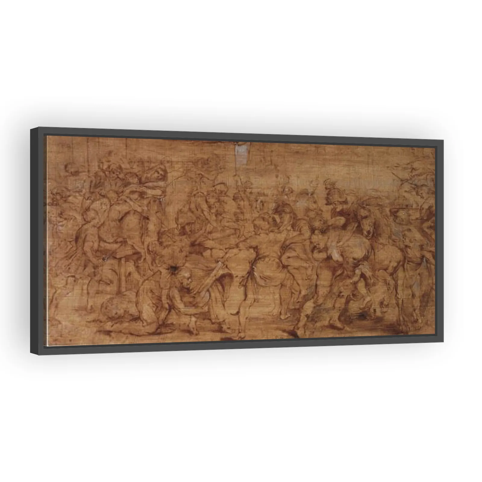 A dramatic Baroque interpretation of the Roman foundation myth rendered with Rubens’ signature energy: muscular figures, swirling diagonals, and luminous color combine to depict abduction, conflict, a...