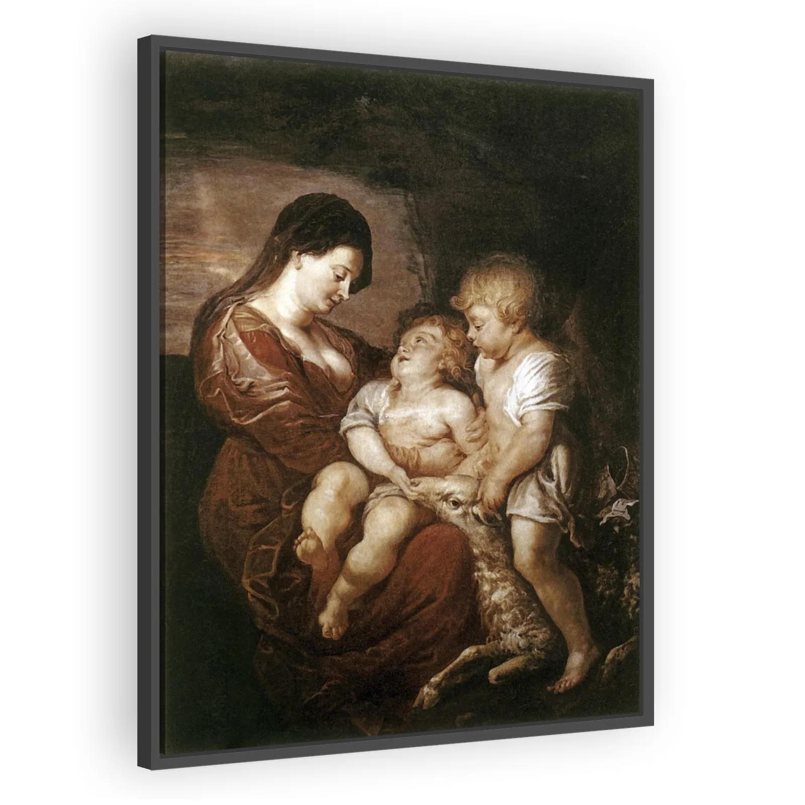 A late work associated with Peter Paul Rubens, the composition warmly depicts the Virgin Mary with the Christ Child and the young St John the Baptist—an intimate, devotional scene combining Baroque dr...