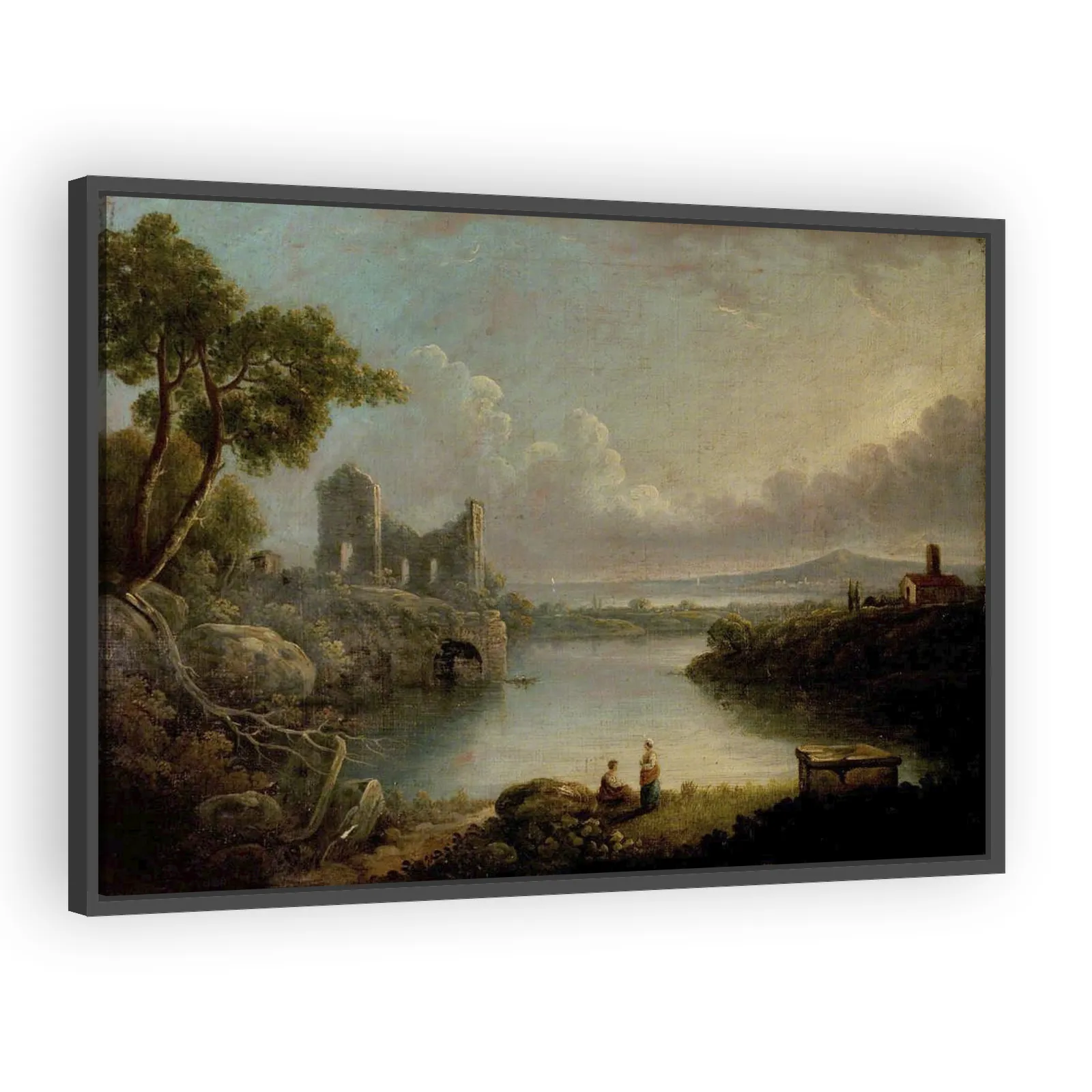 A sweeping classical landscape by Richard Wilson, blending riverine foregrounds and a distant seascape punctuated by ruined architecture. This evocative scene showcases Wilson’s mastery of light, comp...