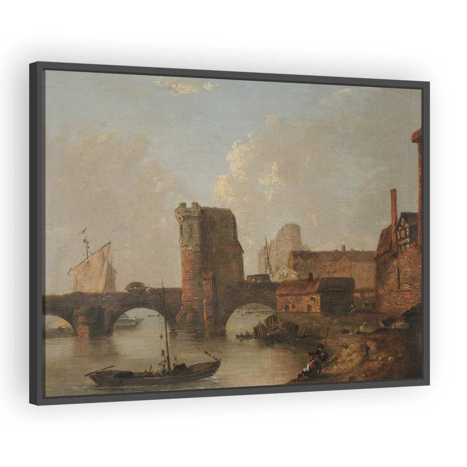A serene landscape by Richard Wilson depicting Shrewsbury’s historic bridge and river. Wilson’s classical composition and subtle tonal handling make this a refined example of 18th‑century British land...