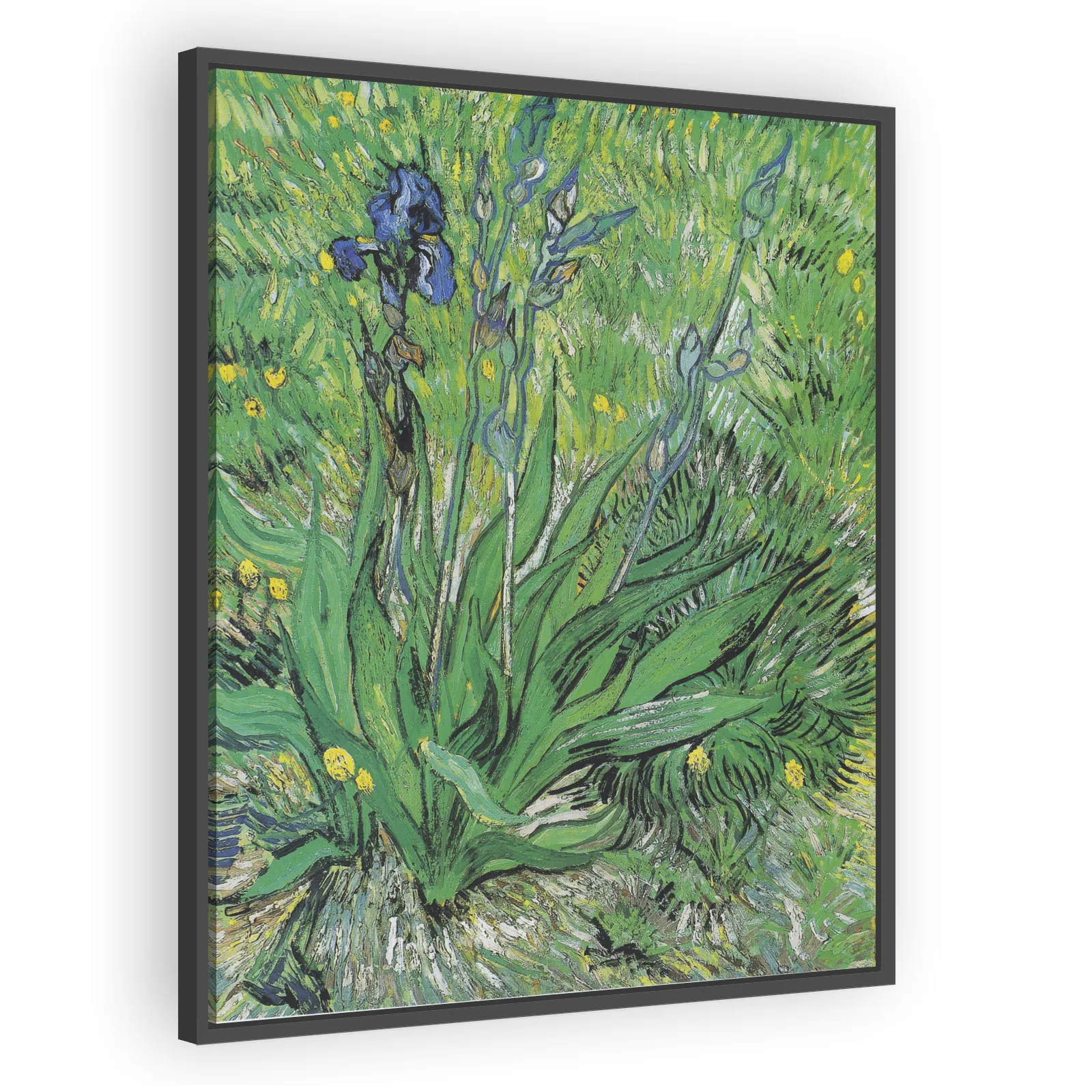 A luminous study of irises painted by Vincent van Gogh in 1889, showcasing his dynamic brushwork, vibrant blues and greens, and expressive use of color. A celebrated example of his Saint-Rémy period t...