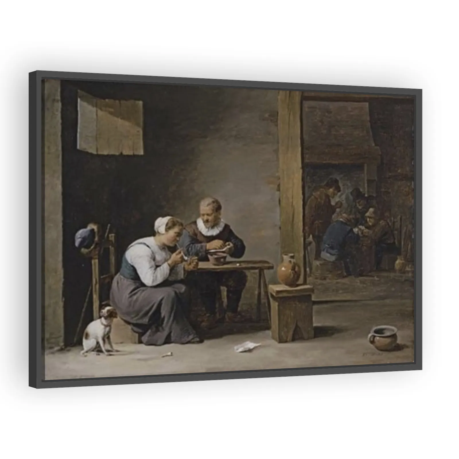A convivial domestic scene by David Teniers the Younger (c.1650): a seated man and woman smoke a pipe in an interior while peasants play cards in the background. Rich genre detail and warm tonalism in...