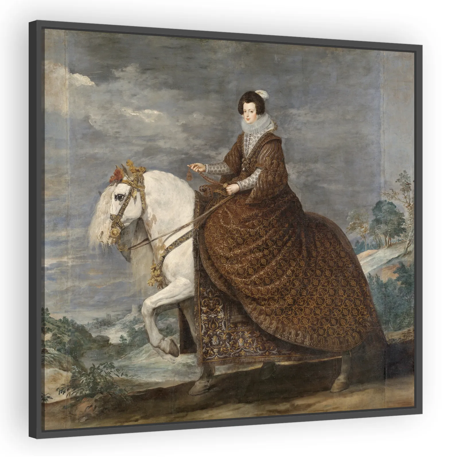 A commanding 1631 equestrian portrait by Diego Velázquez depicting Elisabeth of France in regal poise. Celebrated for its compositional authority, painterly handling, and courtly symbolism, this canva...