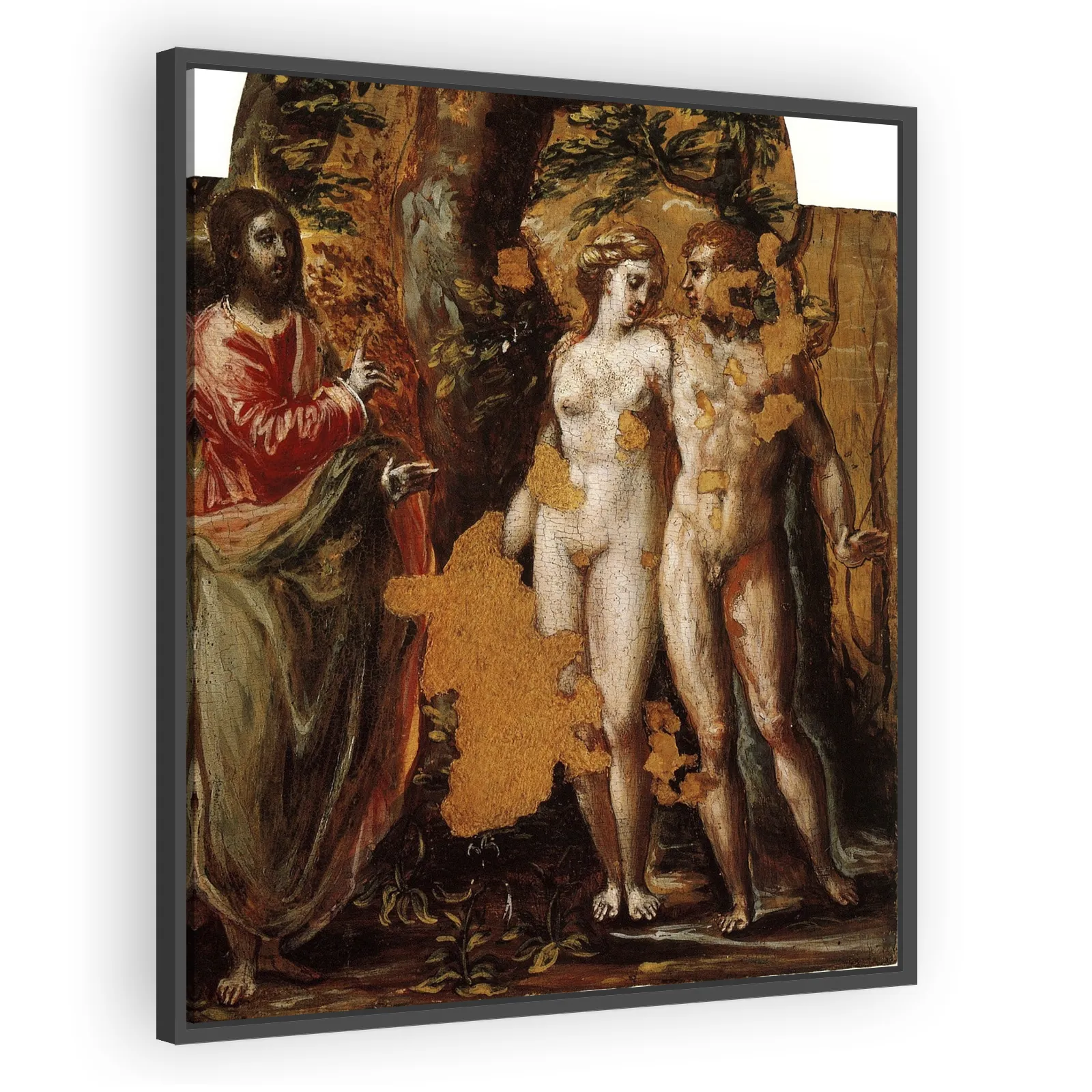 Early El Greco triptych panel depicting Adam and Eve before the Eternal Father (1568). A powerful Mannerist composition blending Byzantine heritage and Venetian colorism—ideal for collectors drawn to...