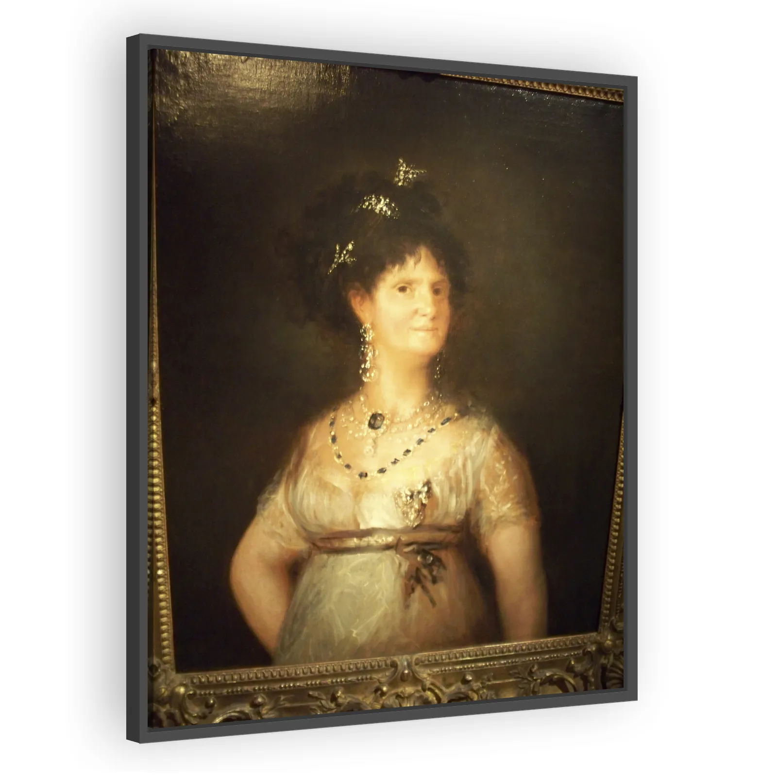 Francisco Goya’s 1800 portrait of Queen Maria Luisa of Spain captures regal poise and psychological insight. A masterful example of Goya’s court portraiture, it balances formal refinement with express...
