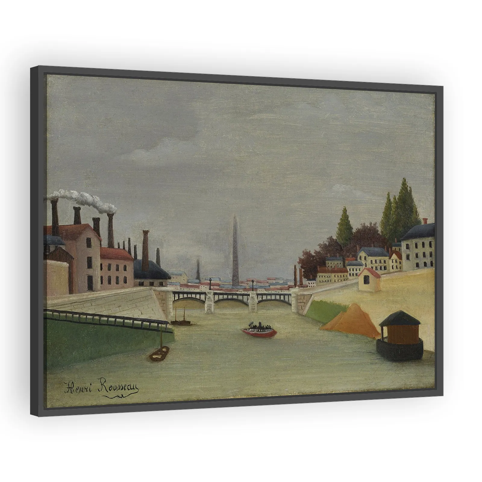 Henri Rousseau’s ca. 1891 depiction of Paris captures the Pont de Grenelle and Trocadéro with his characteristic naïve vision—flat planes, vivid color, and a poetic take on urban modernity.