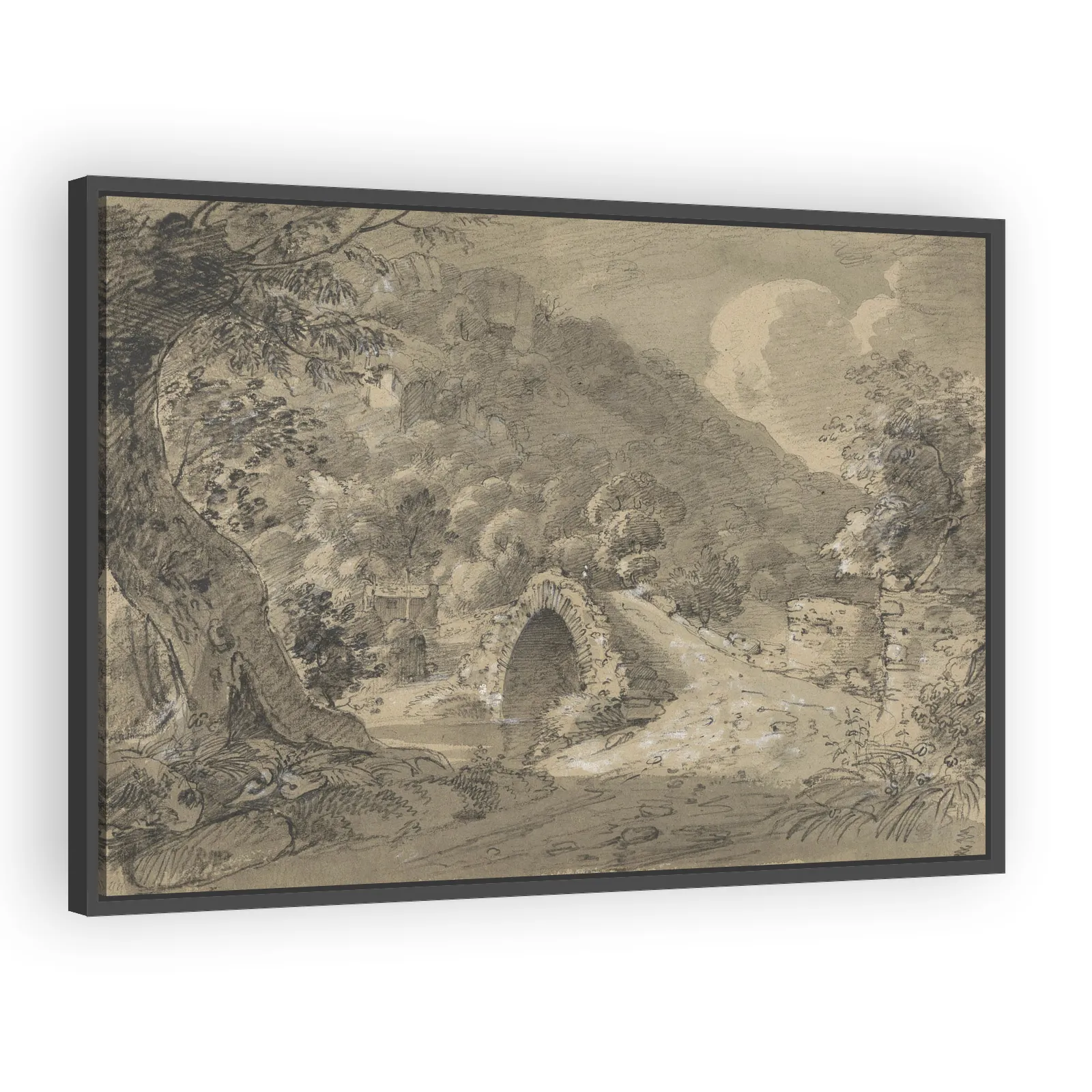 A lyrical 1816 landscape by Isaac Weld capturing rugged terrain, a humble riverside dwelling and a stone bridge. Delicate drawing and atmospheric shading make this study of nature ideal for collectors...