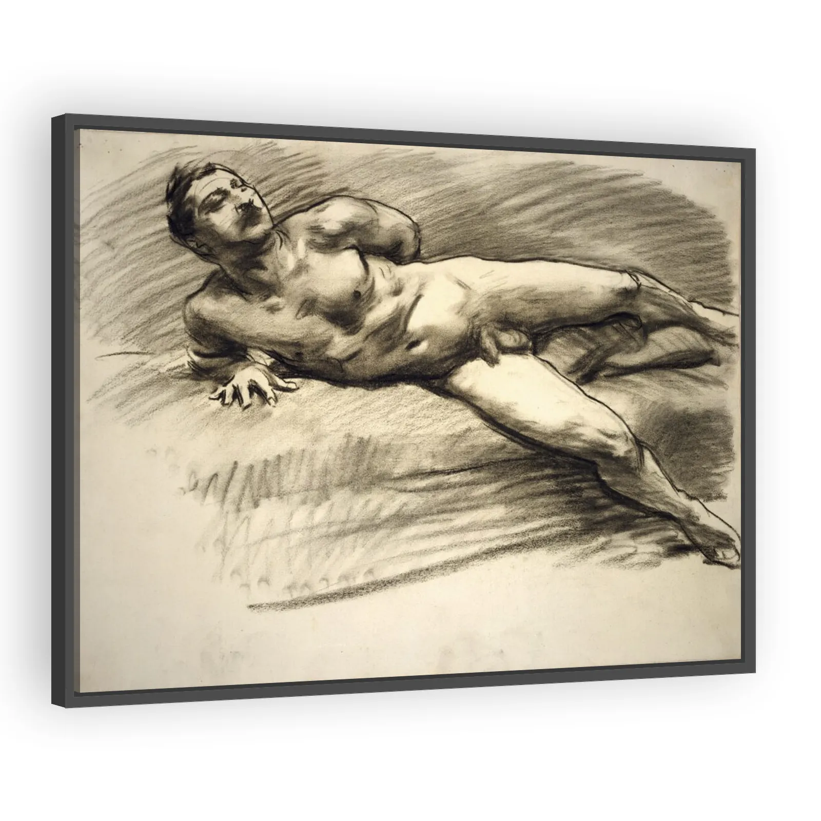 A striking 1902 study by John Singer Sargent, this recumbent male nude captures the artist’s mastery of draftsmanship, light, and anatomical observation. Poised between classical study and modern sens...
