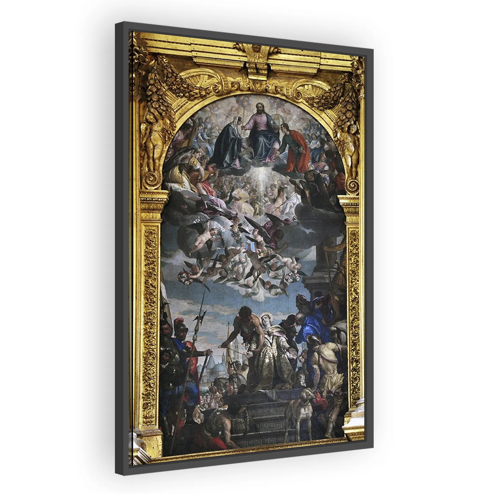 A dramatic late-16th-century altarpiece by Paolo Veronese, depicting the martyrdom of Saint Justina with luminous color, grand composition, and theatrical perspective. A striking example of Venetian R...