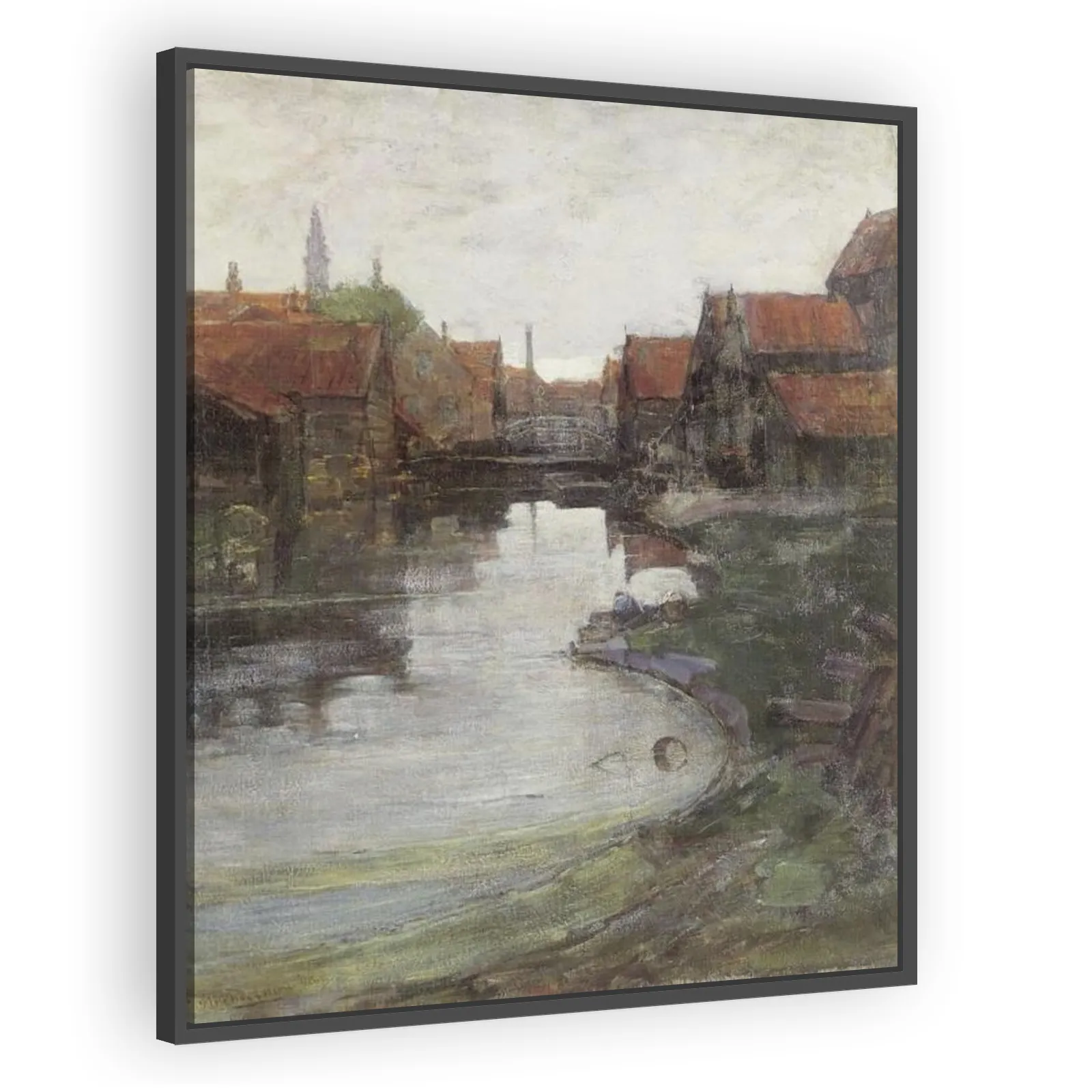 A serene late-19th-century cityscape by Piet Mondrian, capturing Dutch canal-side atmosphere and architectural detail. This early work reflects Mondrian’s representational skill and evolving vision th...