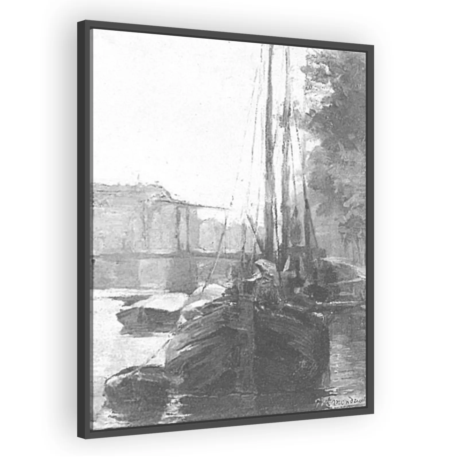 An early Piet Mondrian cityscape capturing Amsterdam’s Waalseilandsgracht with a bridge and moored tjalk barges. Notable for its representational detail, atmospheric light, and hints of the compositio...
