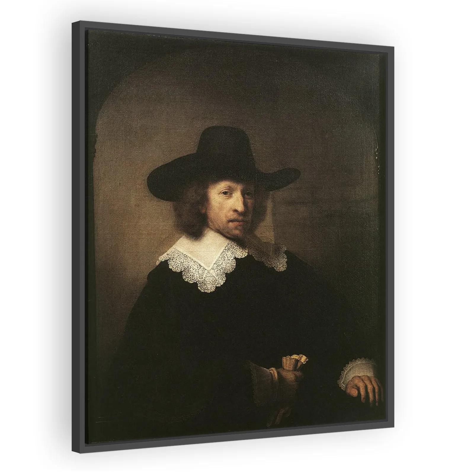 Rembrandt’s 1641 portrait presents Nicolas van Bambeeck framed within a painted surround, showcasing dramatic chiaroscuro, textured brushwork, and psychological immediacy. A striking example of Rembra...