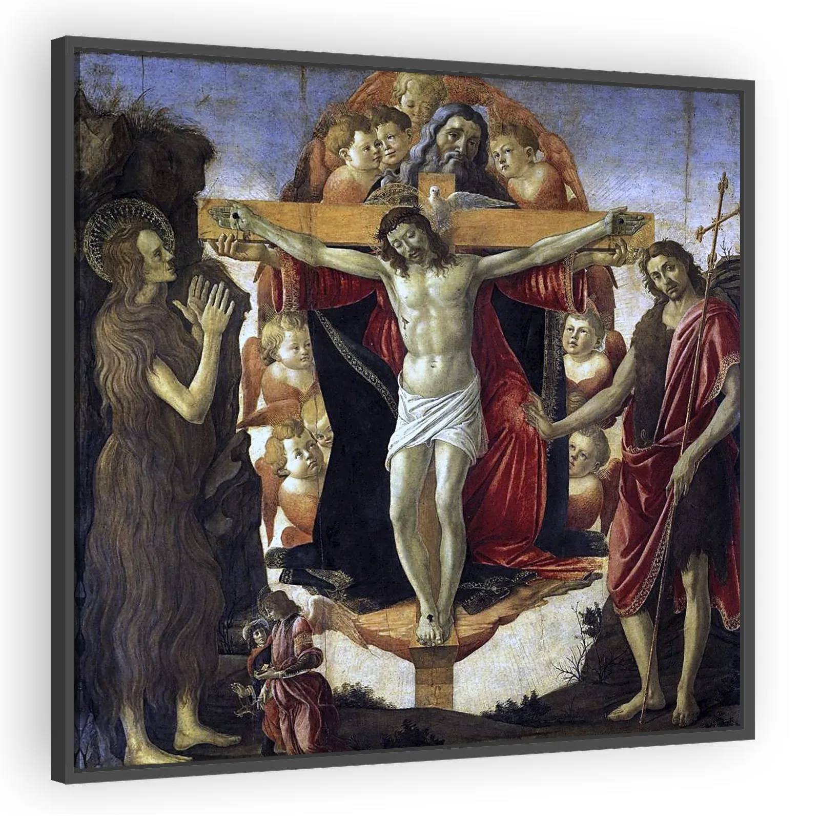 Sandro Botticelli’s 1487 composition pairs solemn devotion with lyrical grace. This Florentine Renaissance work unites the Holy Trinity with Mary Magdalene, John the Baptist and the figures of Raphael...