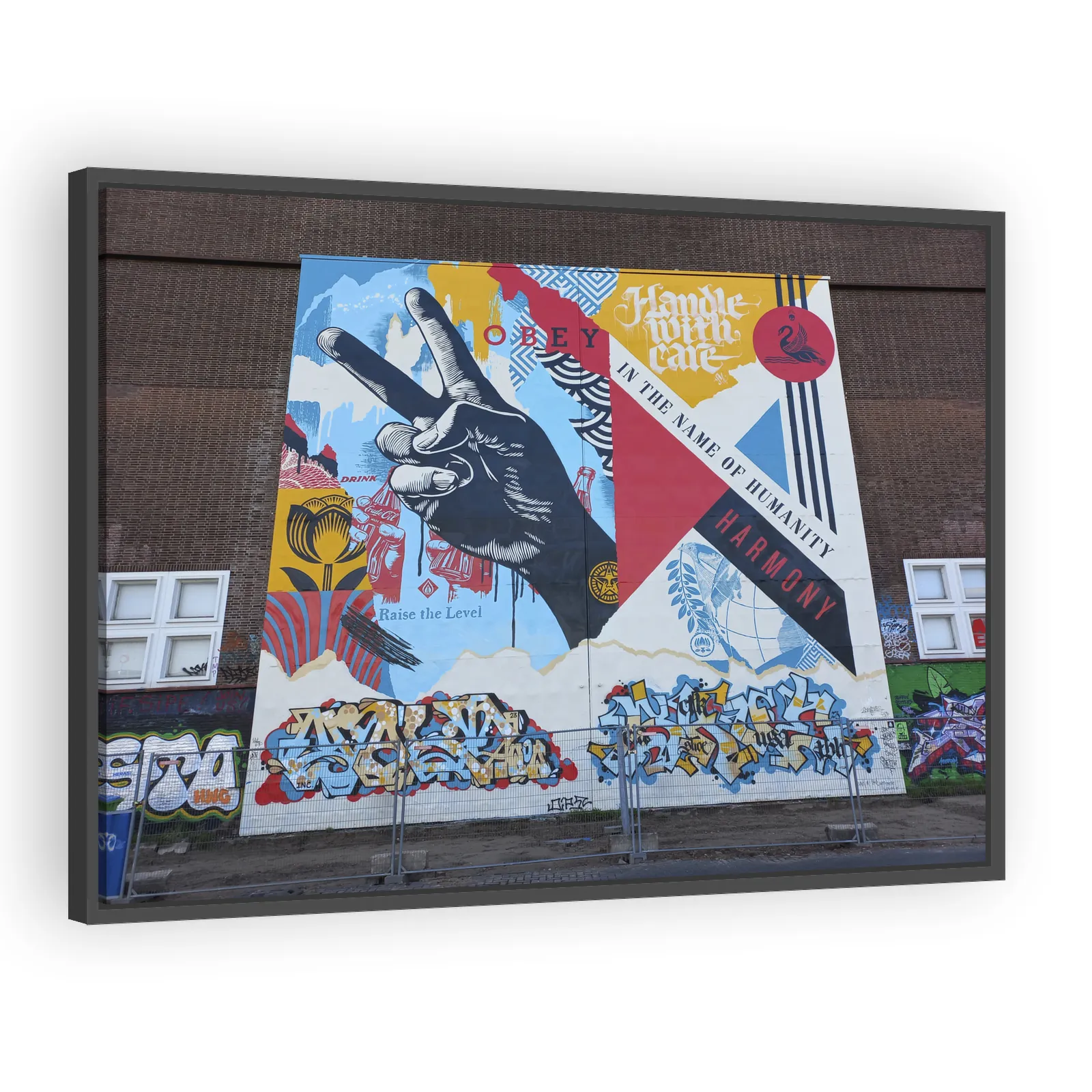 Bold urban mural by Shepard Fairey at STRAAT Museum, NDSM-terrein, Amsterdam-Noord. A visually striking, politically aware composition blending street-art iconography with layered graphic techniques—i...