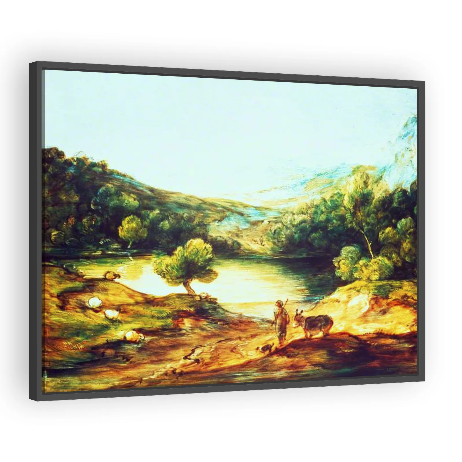 Thomas Gainsborough’s 1786 landscape captures a tranquil rural scene with luminous atmosphere and painterly freedom. Its poetic composition—shepherd, donkey and sheep by a lake—exemplifies Gainsboroug...