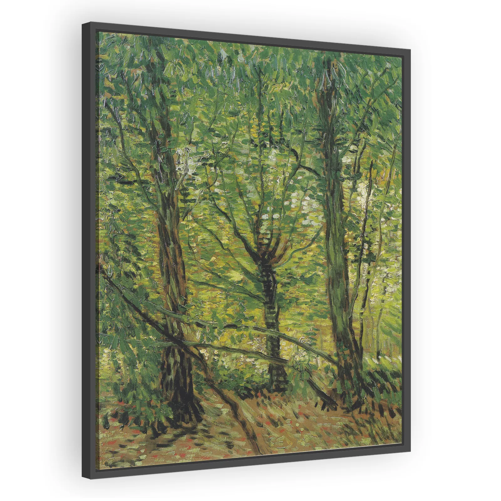 A vivid landscape by Vincent van Gogh that captures the restless energy of trees and undergrowth. Bold brushwork, dynamic composition, and rich color make this piece a striking example of Van Gogh’s e...