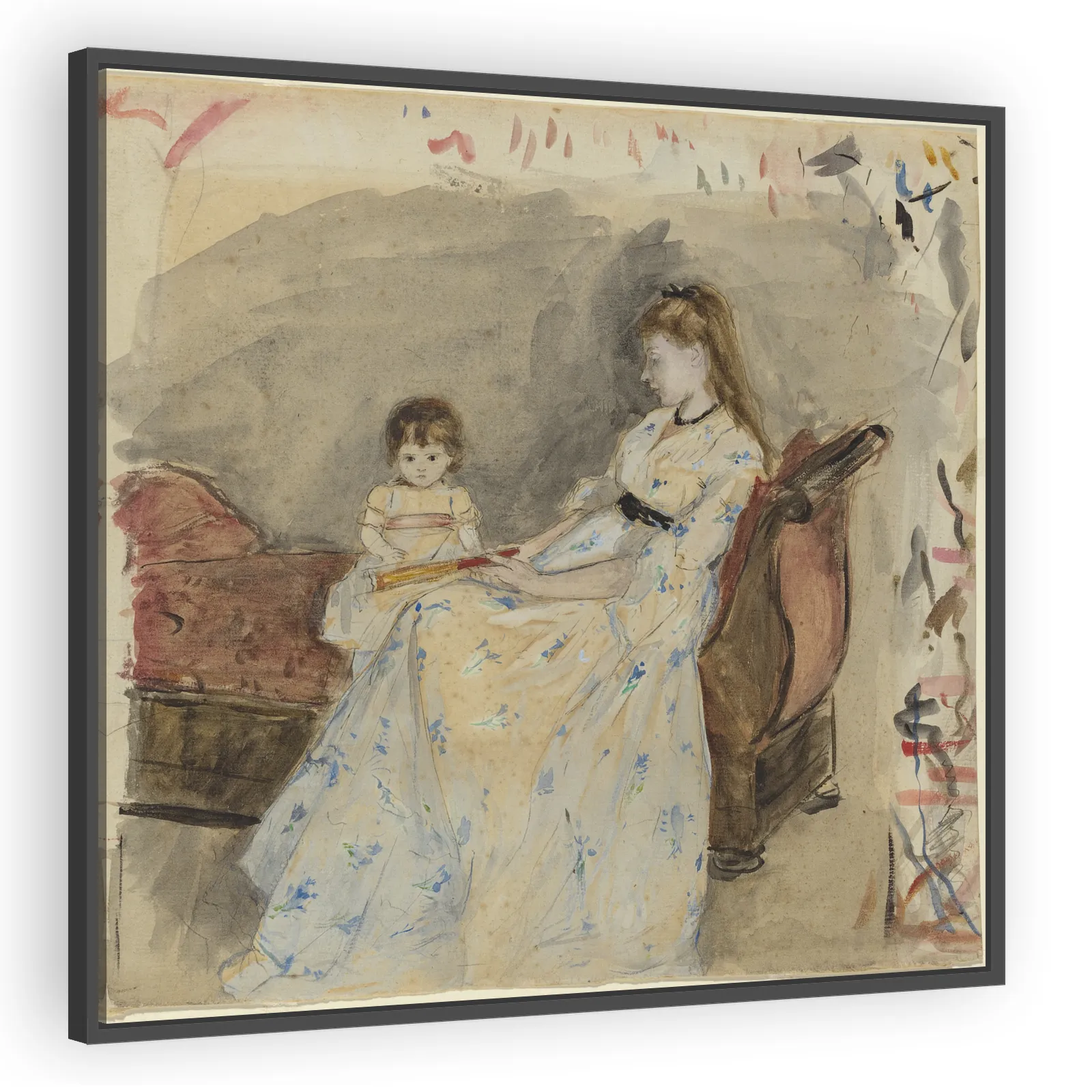 A tender 1872 watercolor and graphite portrait by Berthe Morisot depicting her sister Edma and niece Jeanne. Intimate Impressionist sensibility and delicate draftsmanship make this work a study in fam...