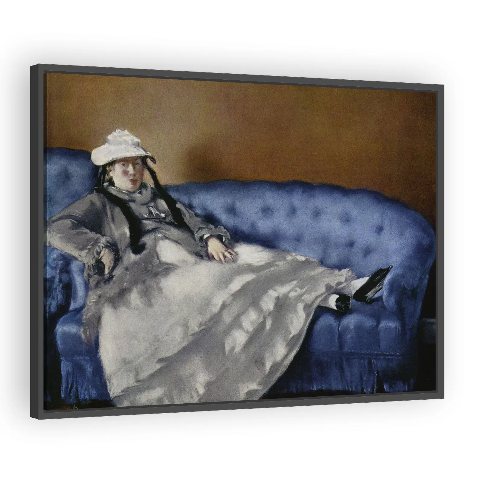 A restrained yet intimate portrait by Édouard Manet (1874), capturing his wife on a cobalt-blue sofa. The work blends realist clarity with emerging Impressionist color and brushwork—an evocative study...