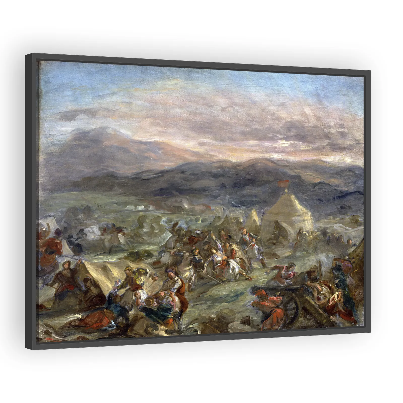 Eugène Delacroix's dramatic 1860 composition captures the heroic death of Greek commander Markos Botsaris with Romantic intensity — powerful color, dynamic brushwork, and a stirring narrative ideal fo...