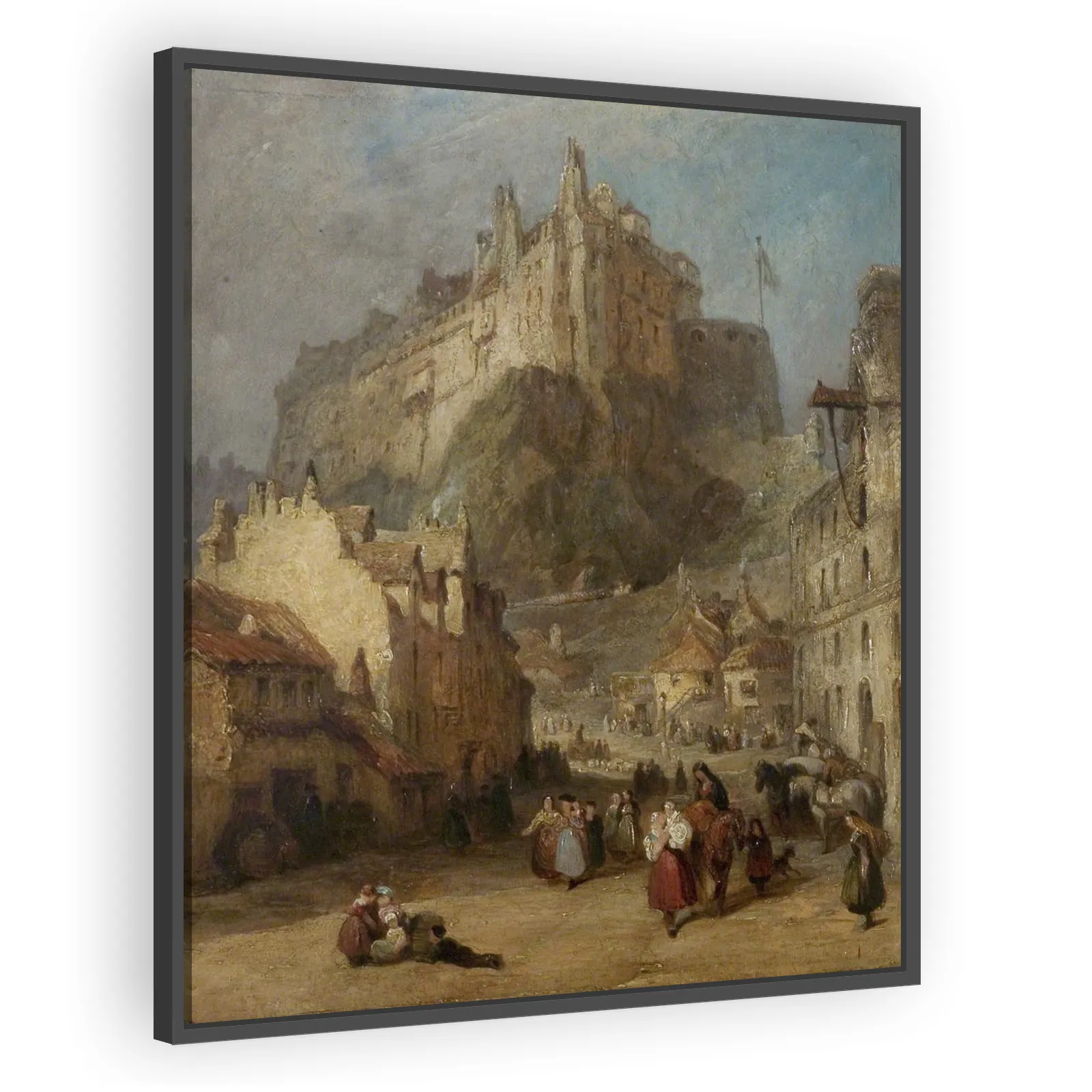 A finely observed topographical view by George Jones capturing Edinburgh Castle looming above the bustling Grassmarket. Elegant handling of light and atmospheric perspective makes this piece appealing...