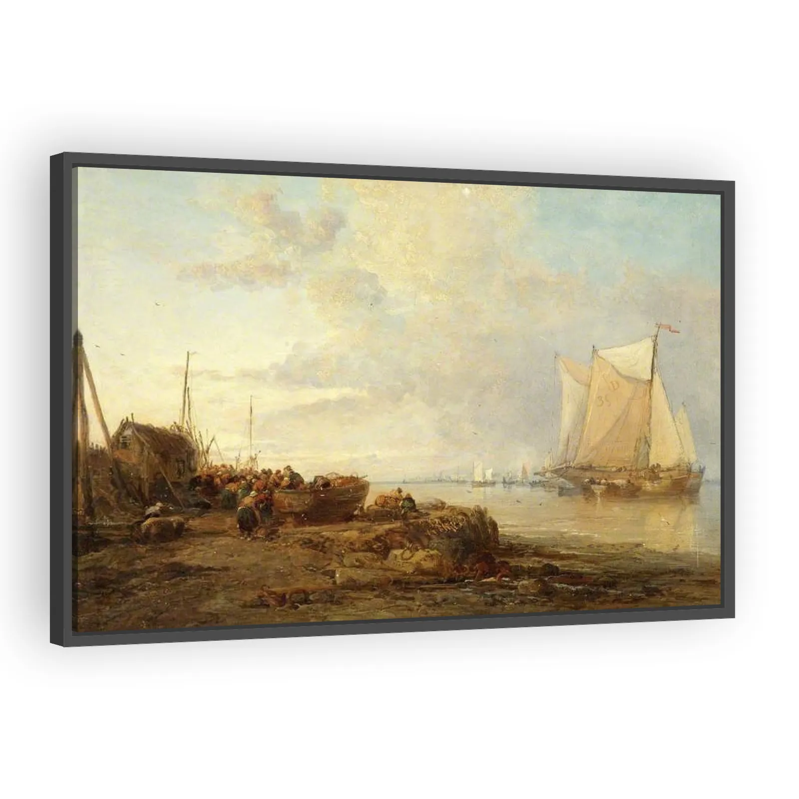 A luminous 1870 marine scene by James Webb capturing the everyday labor and coastal atmosphere of Dutch fishermen, rendered with realist detail and evocative light—ideal for collectors of 19th-century maritime painting.