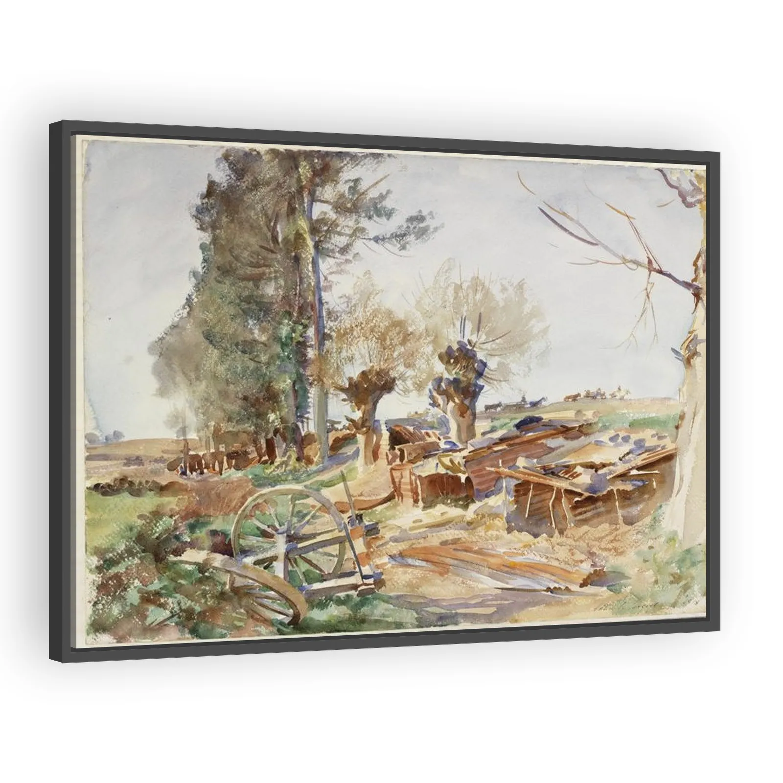 John Singer Sargent’s Old Bivouacs (1918) records the quiet ruin of makeshift wartime shelters: a line of battered wooden and corrugated-iron bivouacs beside trees, with the broken wheels of a cart in...