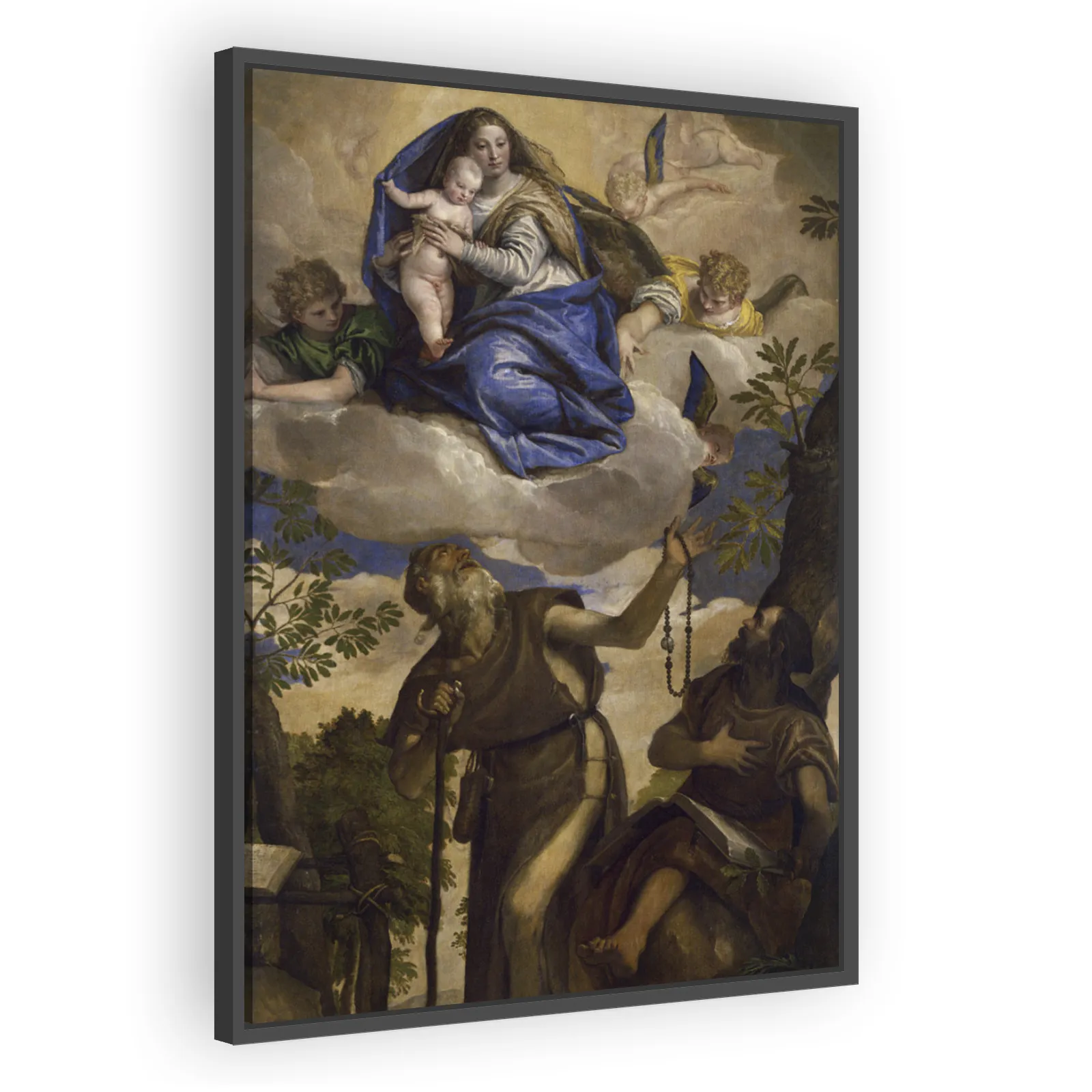 A luminous devotional scene by Paolo Veronese depicting the Virgin and Child with angels presenting themselves to Saints Anthony Abbot and Paul the Hermit. Rich color, graceful figures, and serene spi...