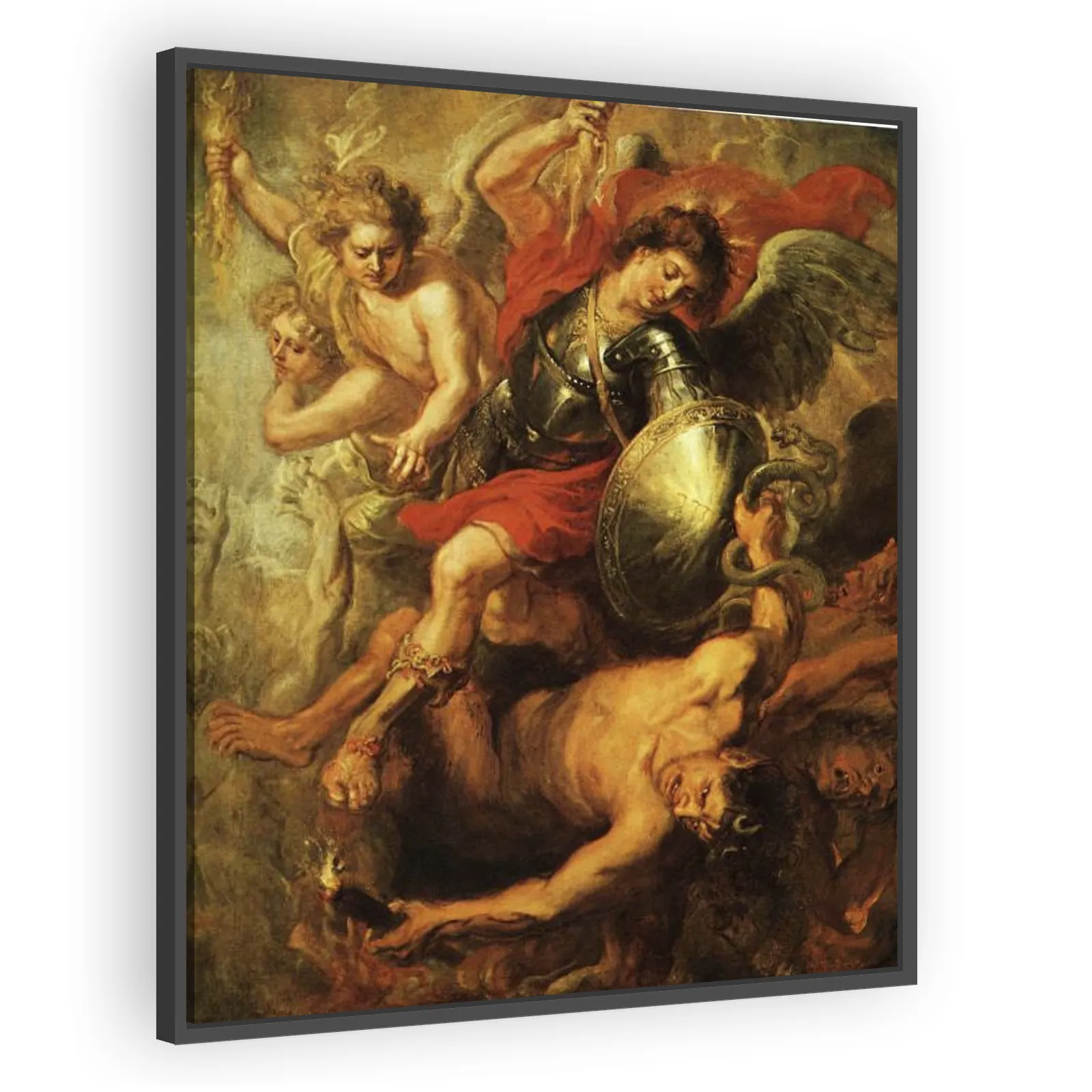 A dramatic Baroque depiction by Peter Paul Rubens (1635) of the celestial battle from Revelation. Vigorous movement, rich color, and sculptural forms convey divine triumph—an emblematic example of Rub...