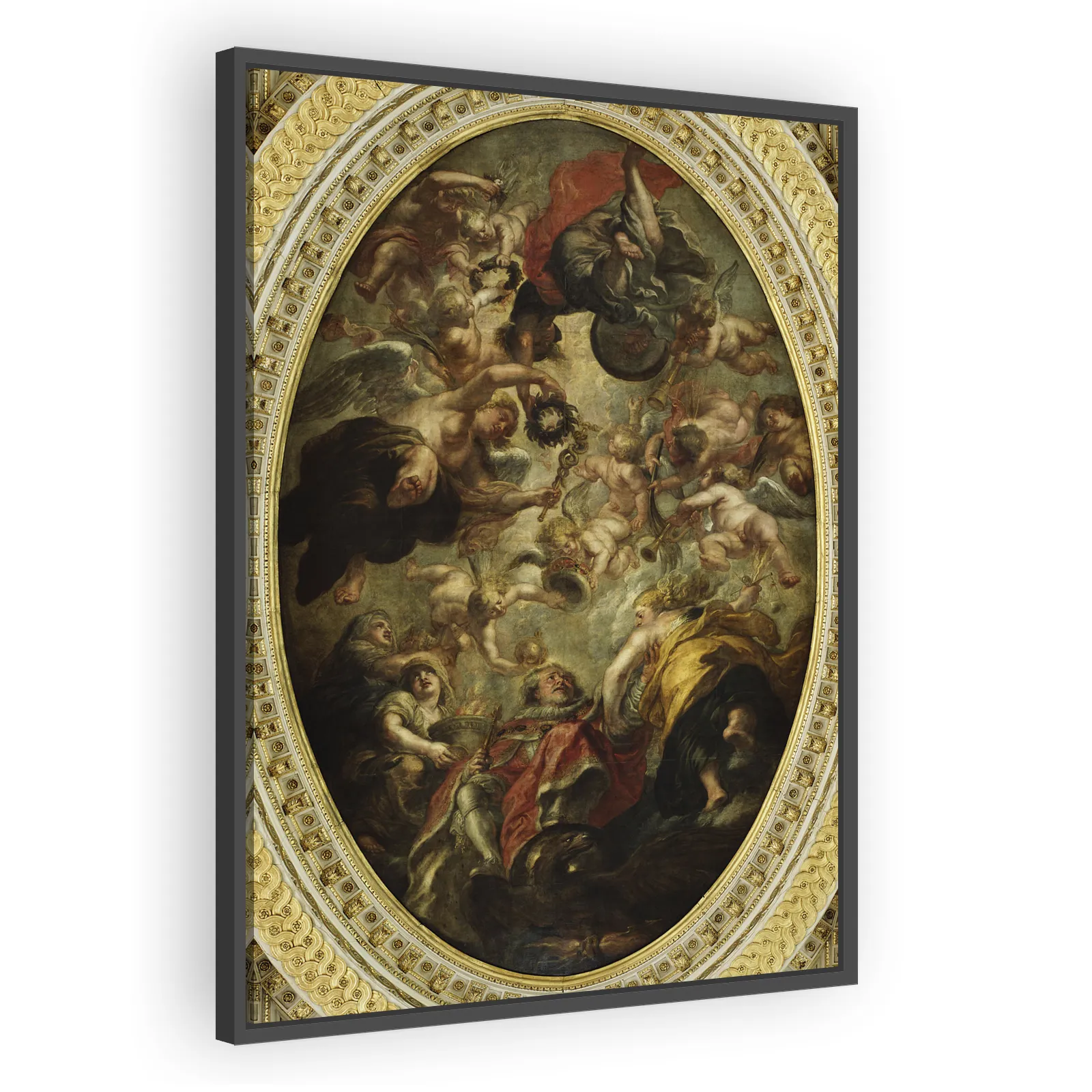 The Apotheosis of James I, executed by Peter Paul Rubens in 1633, is a striking example of Baroque allegorical painting created for a ceremonial architectural setting. Painted in oil on canvas and now...