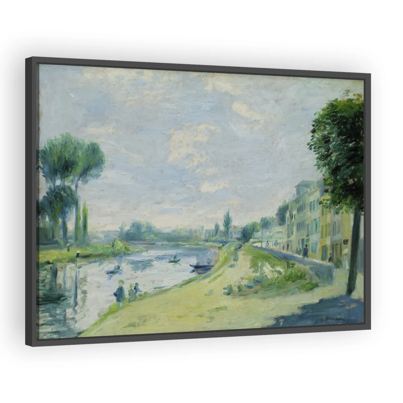 A luminous Impressionist view by Pierre-Auguste Renoir from 1871, capturing the shimmering light and leisurely atmosphere along the Seine at Bougival—an evocative study in color, atmosphere, and every...