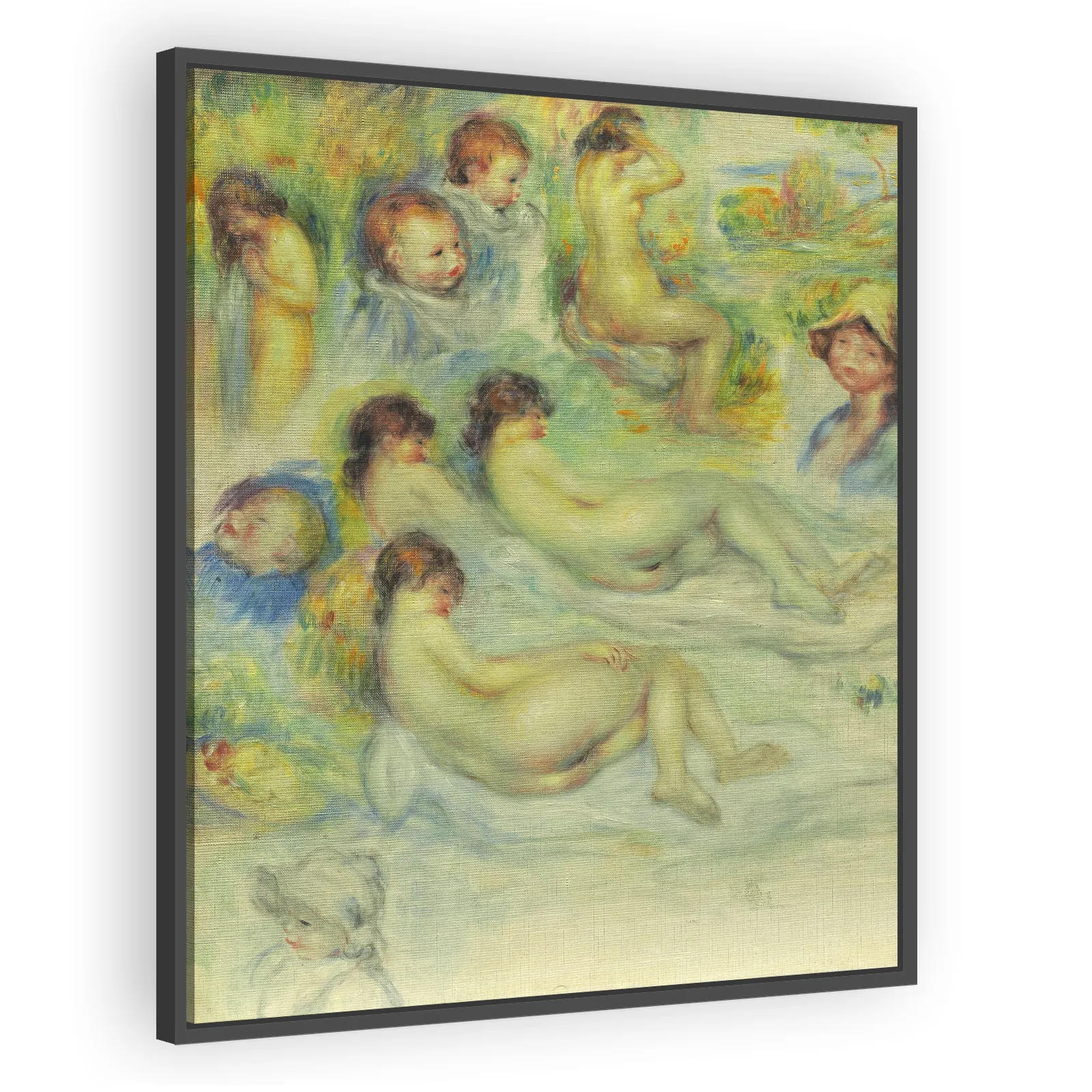 A lively 1885 study by Pierre-Auguste Renoir, pairing intimate portraits of his mother Aline Charigot with figure studies and a sunlit landscape. A fine example of late Impressionist technique, warmth...