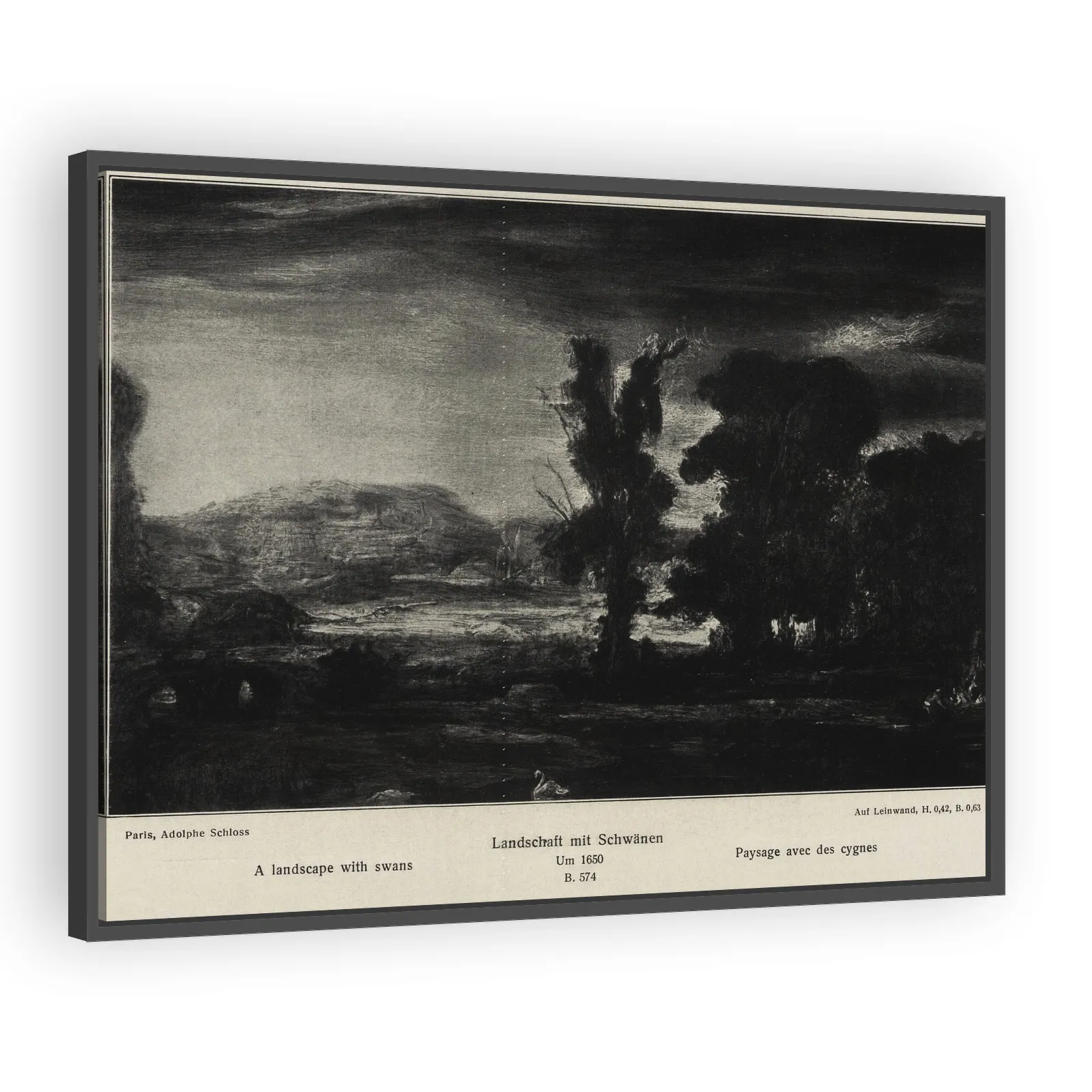 A serene 1650 landscape by Rembrandt, depicting swans in a tranquil waterscape. The work exemplifies Rembrandt’s atmospheric handling of light and expressive brushwork, appealing to collectors who pri...