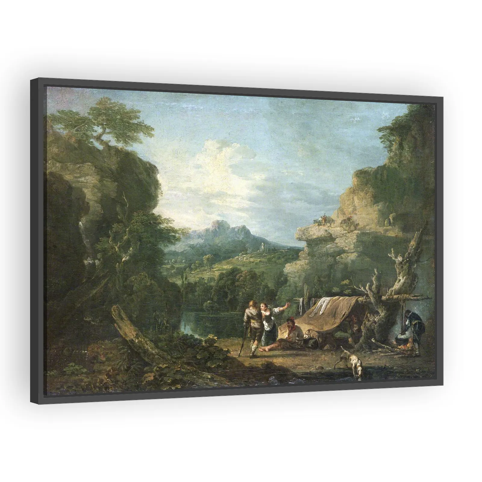 A dramatic mid-18th-century landscape by Richard Wilson, depicting banditti gathered around a tent. Merging classical composition with naturalistic light, the work exemplifies Wilson’s role in shaping...