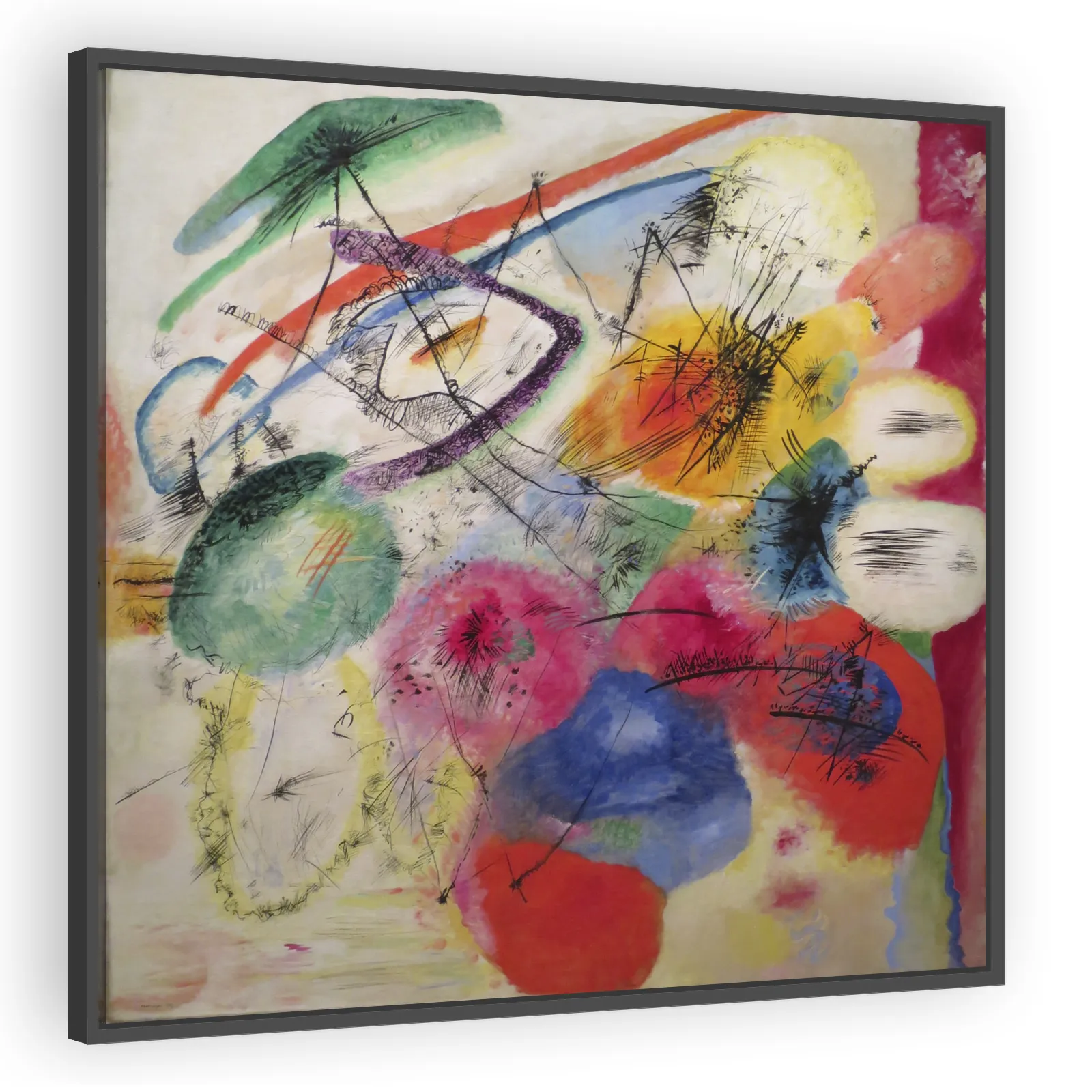Wassily Kandinsky's Black Lines (1913) exemplifies the move toward pure abstraction—dynamic intersecting forms and rhythmic black marks create a musical, spiritual composition that transformed early 2...