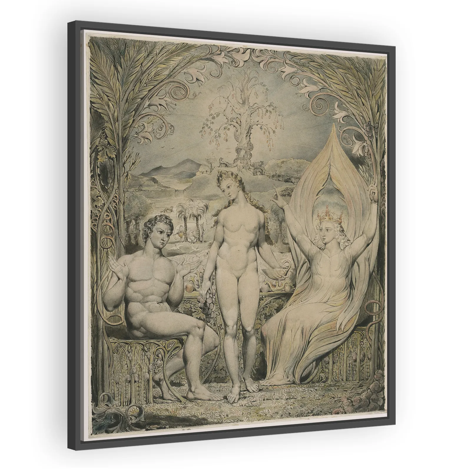 William Blake's luminous 1808 watercolor depicts Raphael instructing Adam and Eve from Milton's Paradise Lost. A striking example of Blake's visionary Romantic style, it combines poetic narrative, sym...