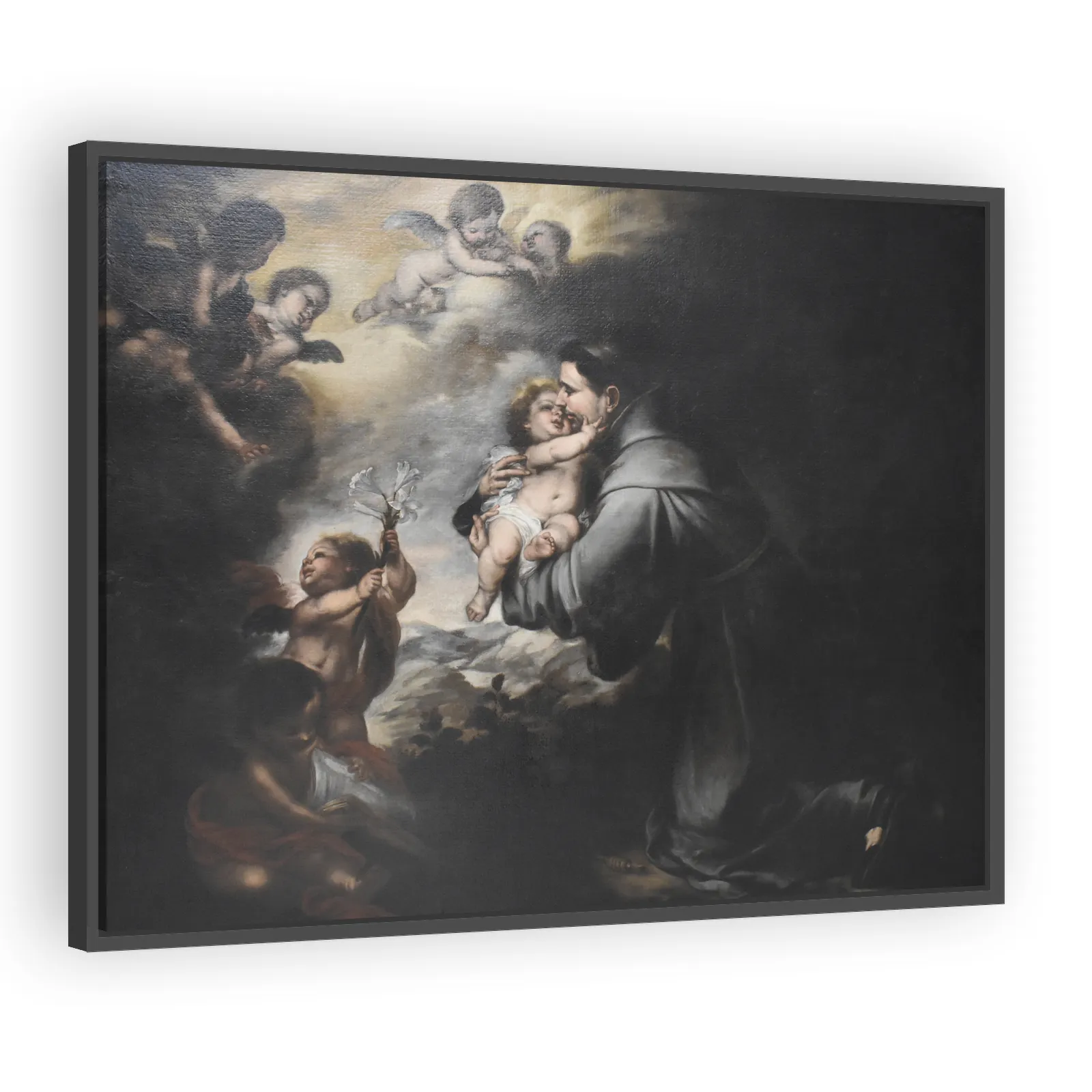 A luminous Baroque devotional painting by Bartolomé Esteban Murillo (1675), depicting Saint Anthony of Padua adoring the Christ Child. Soft chiaroscuro, gentle realism and tender emotion make this Bor...