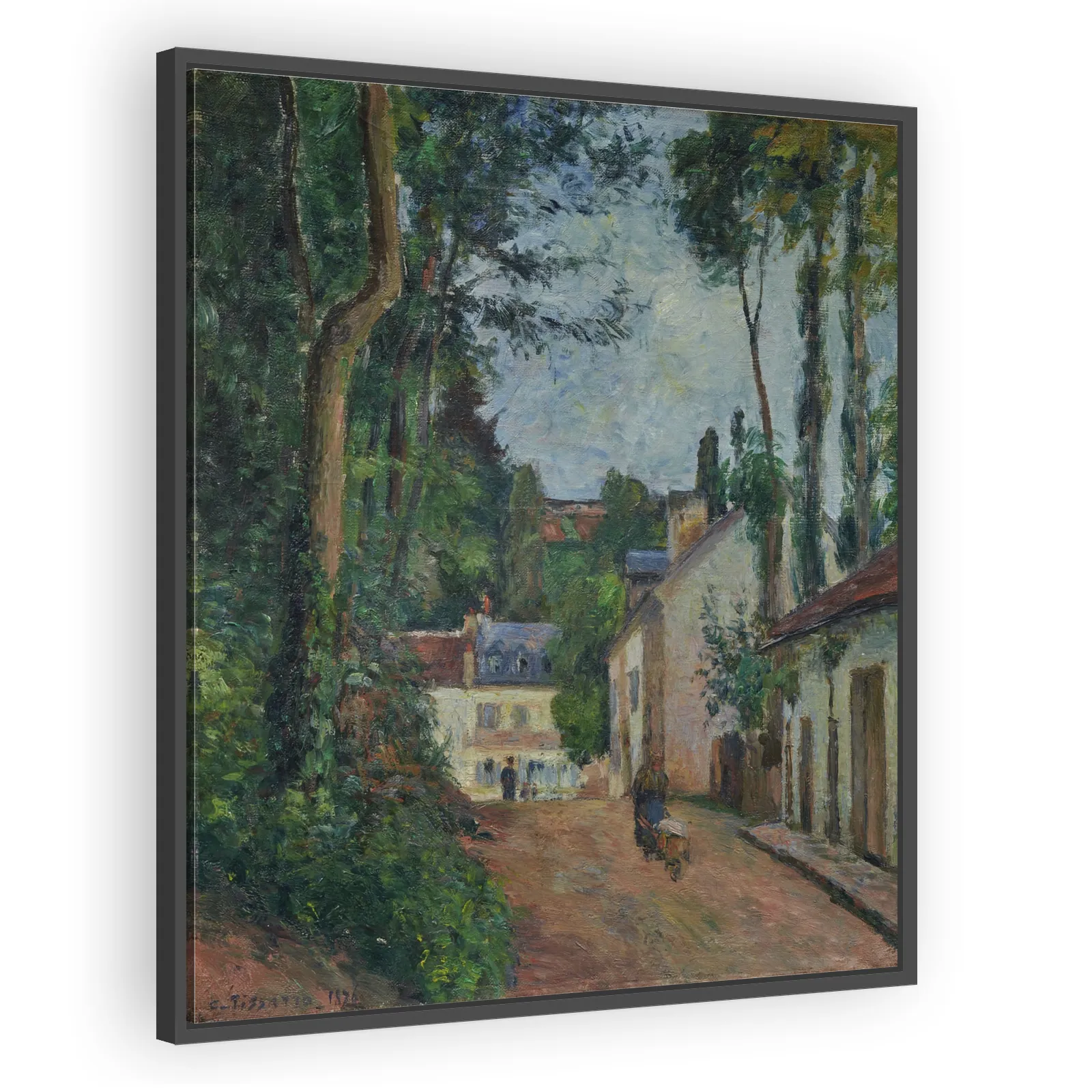 A luminous 1876 street scene by Camille Pissarro, capturing everyday life in Pontoise with loose brushwork, subtle color harmonies, and an Impressionist focus on light — an evocative study of modern u...