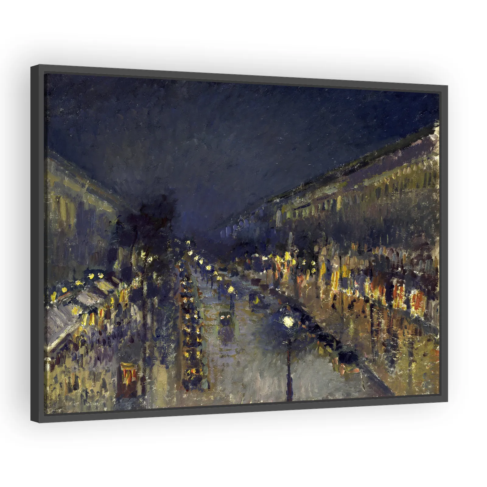Camille Pissarro’s nocturnal view of the Boulevard Montmartre captures shimmering lamplight on wet streets, a rare night scene from his 1897 Paris series that explores urban atmosphere and modern ligh...