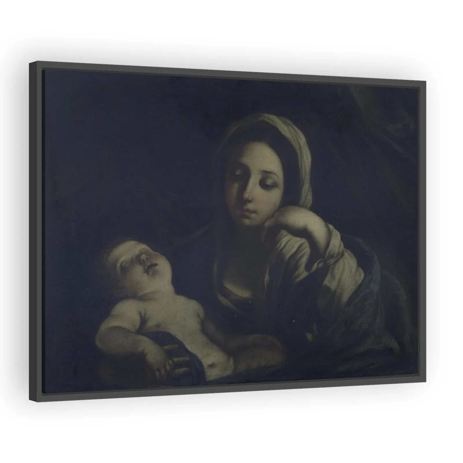 A serene Baroque vision by Guido Reni, depicting the tender Madonna and a sleeping Christ Child. Soft chiaroscuro, graceful composition, and devotional intimacy make this an evocative choice for colle...