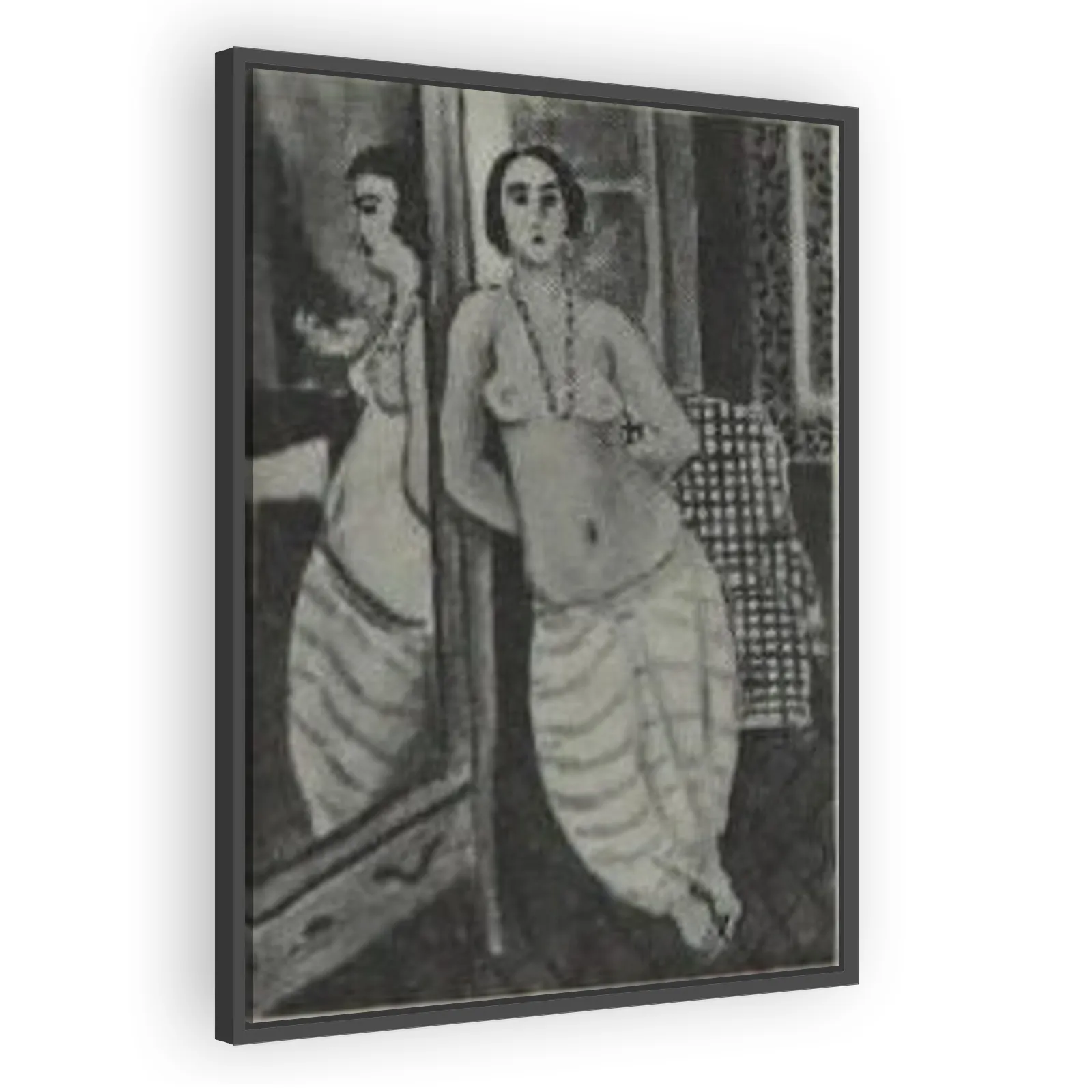 A 1923 Matisse that unites classical line and decorative color. The standing odalisque and her mirror explore reflection, pattern, and modern sensuality—an evocative example of Matisse's mature, refin...