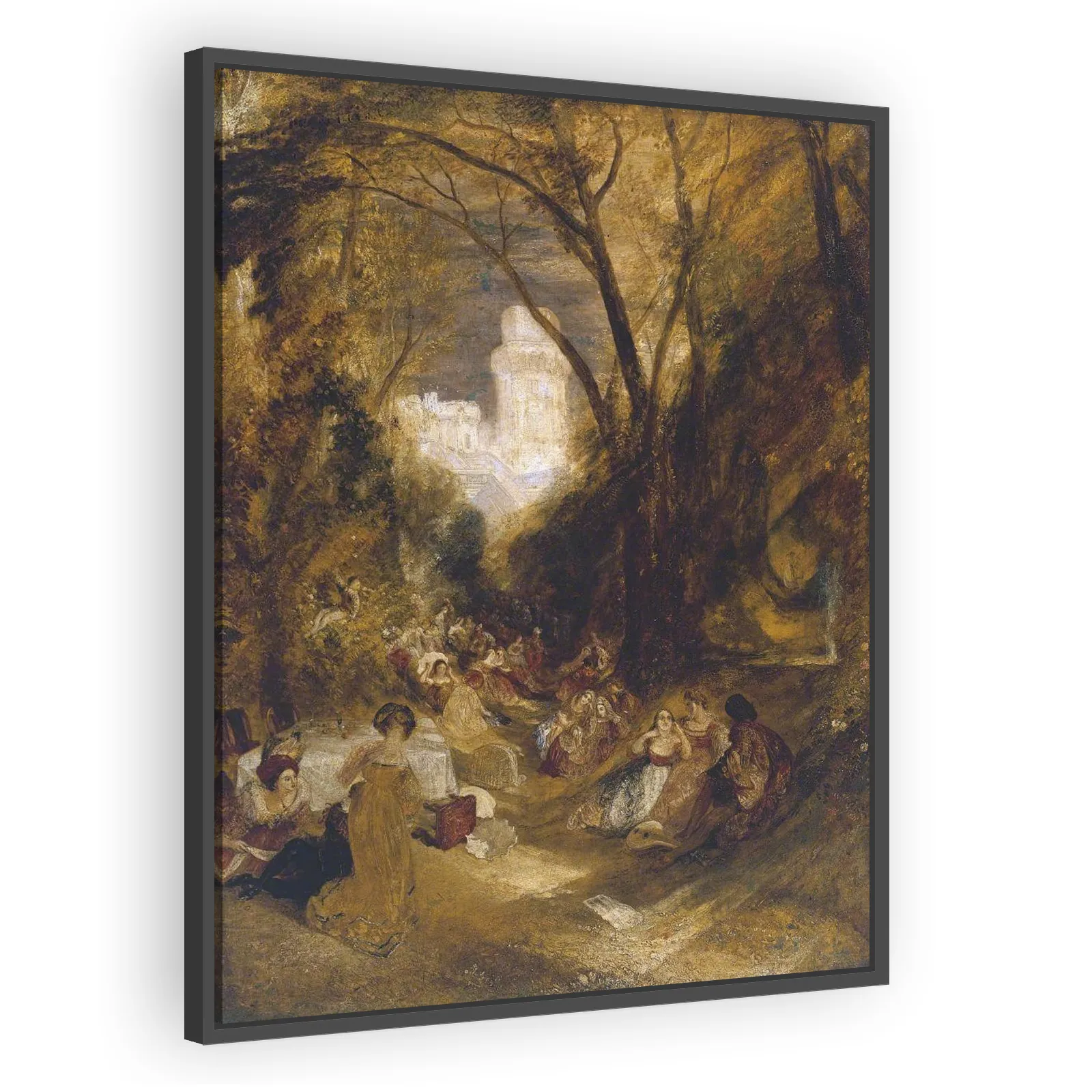 J. M. W. Turner's Boccaccio Relating the Tale of the Bird-Cage (1828) blends literary romance and Romantic-era theatricality. Turner’s luminous handling of color and atmosphere renders a vivid, narrat...