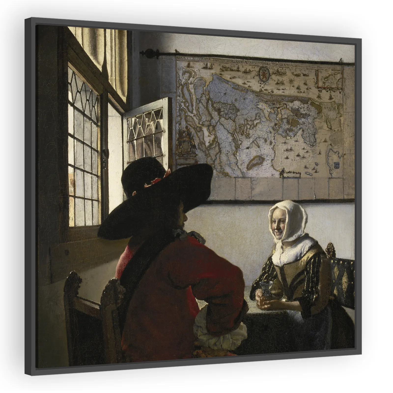 A lively domestic scene by Johannes Vermeer (1658), capturing a flirtatious exchange between an officer and a young woman. This Dutch Golden Age genre painting combines refined light, intimate composi...