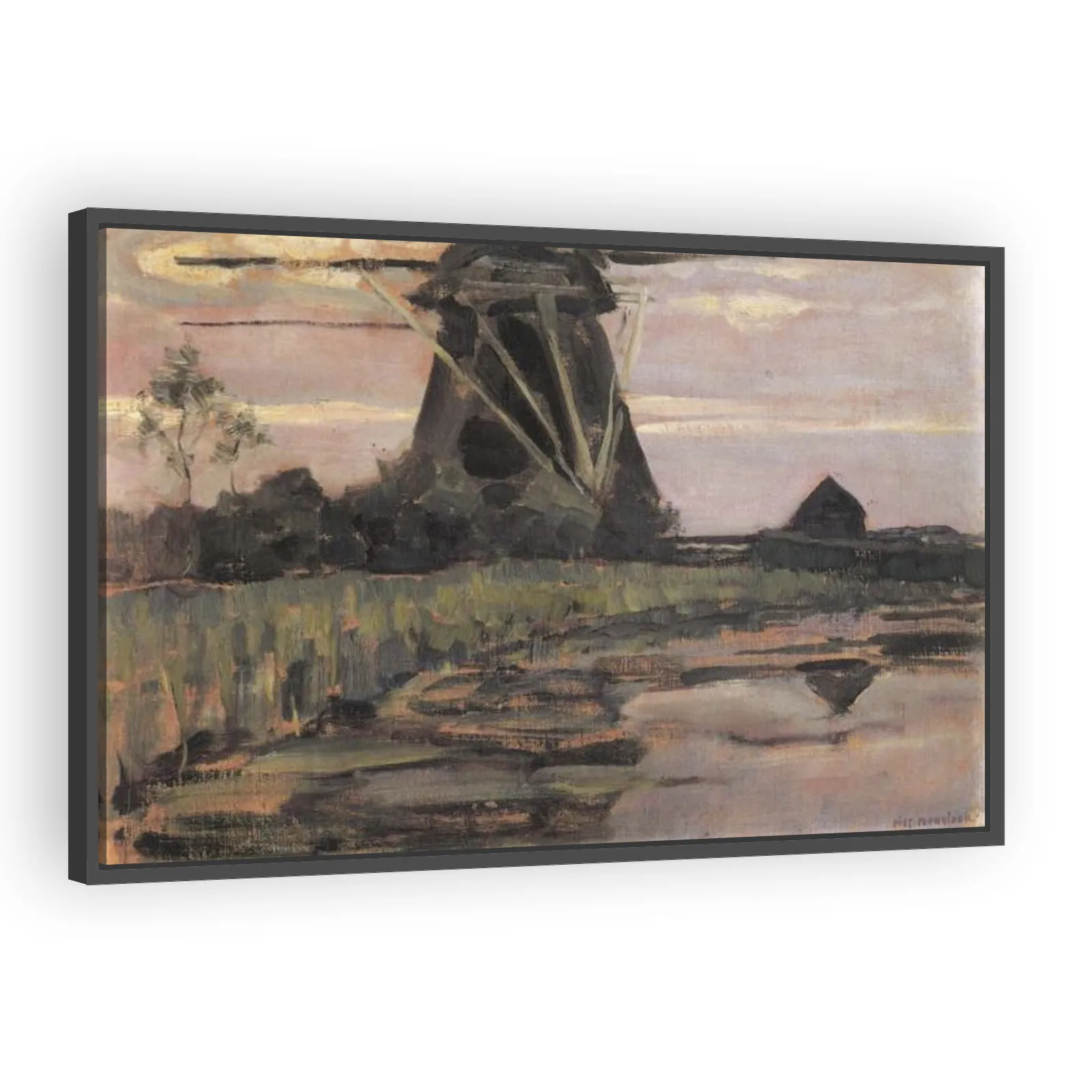 A luminous early Mondrian landscape from 1906, capturing a Dutch mill beneath a streaked pinkish-blue sky. This transitional work blends natural observation with expressive color and brushwork—appeali...