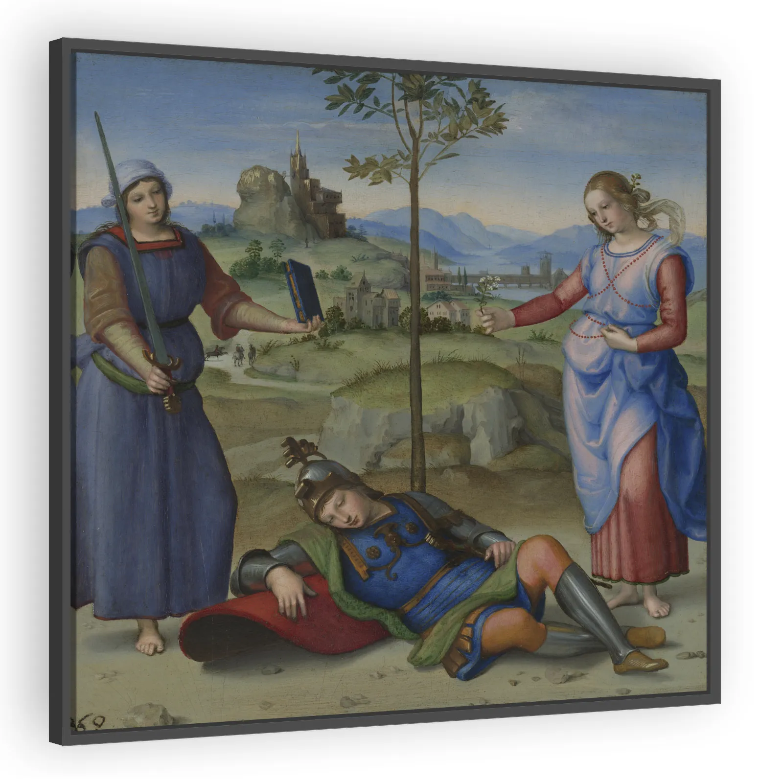 Raphael’s The Dream of a Knight (1504) is an intimate High Renaissance vision combining myth, allegory, and delicate oil-on-poplar technique. Its lyrical landscape and symbolic elements make it a priz...