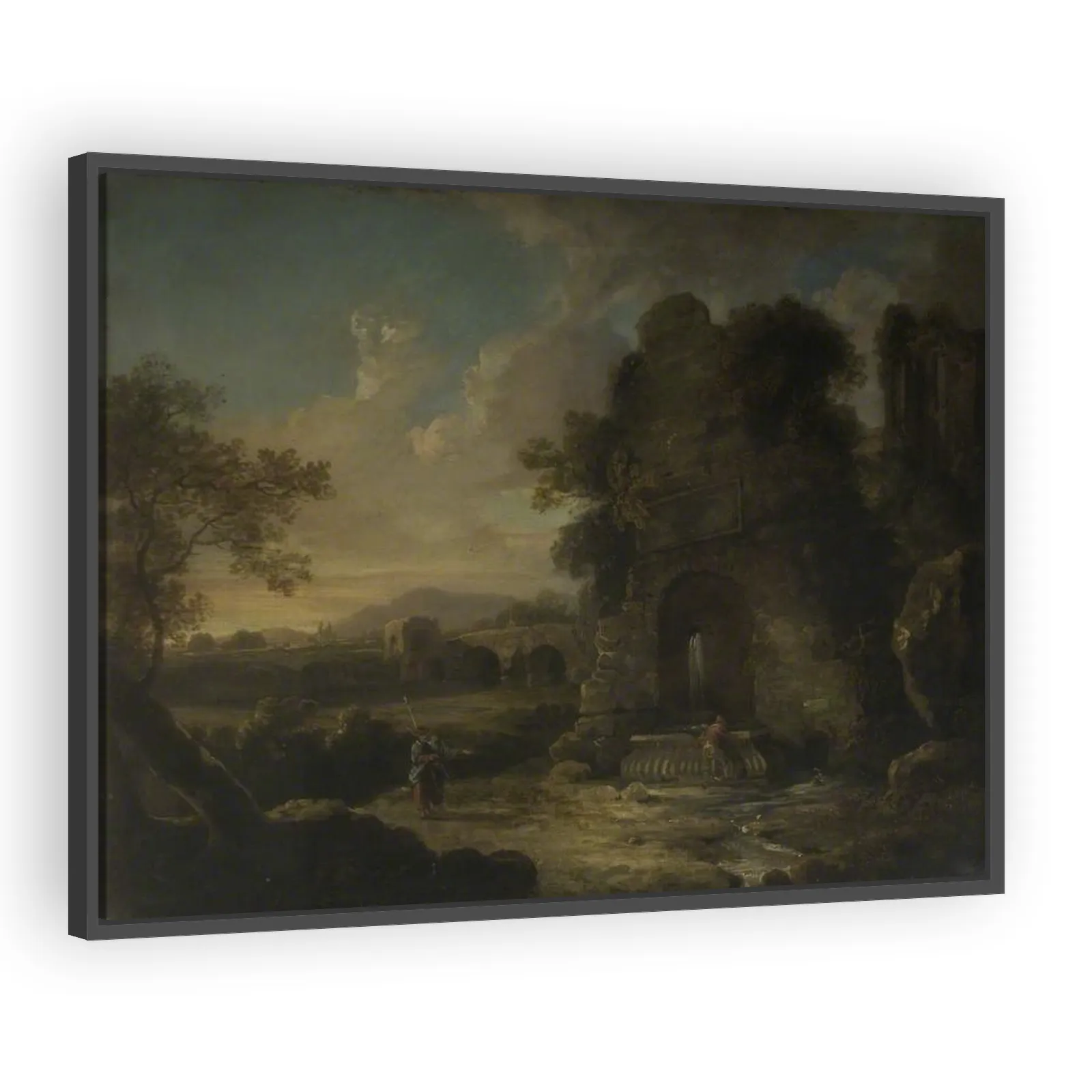 An evocative classical landscape by Richard Wilson, depicting weathered bridge ruins and a tranquil fountain. Wilson’s subtle light and compositional balance make this work a refined example of 18th-c...