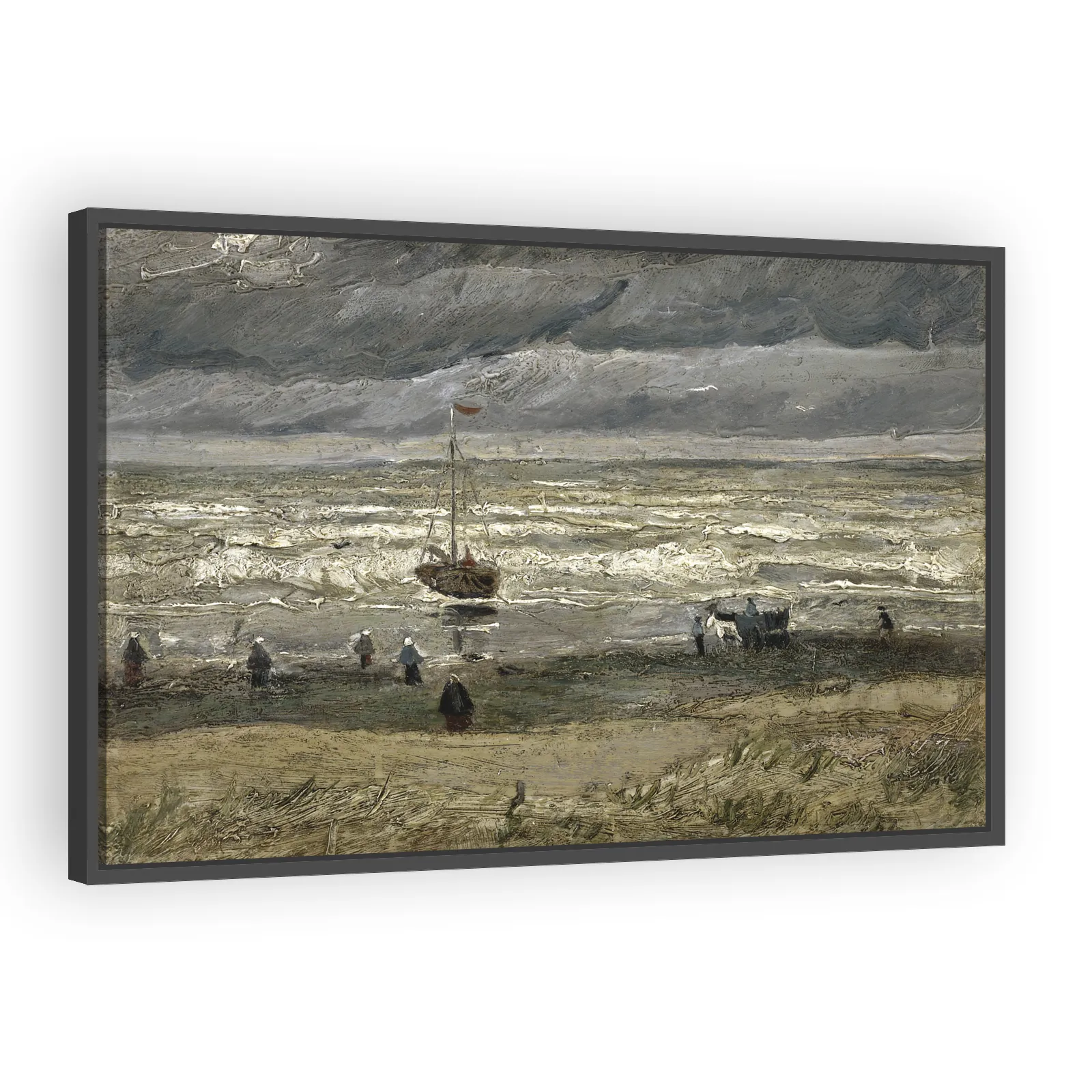 A stormy Scheveningen seascape by Vincent van Gogh (1882), rendered in oil on paper mounted on canvas. This evocative post-impressionist view captures wind, surf and a lone boat—appealing to collector...