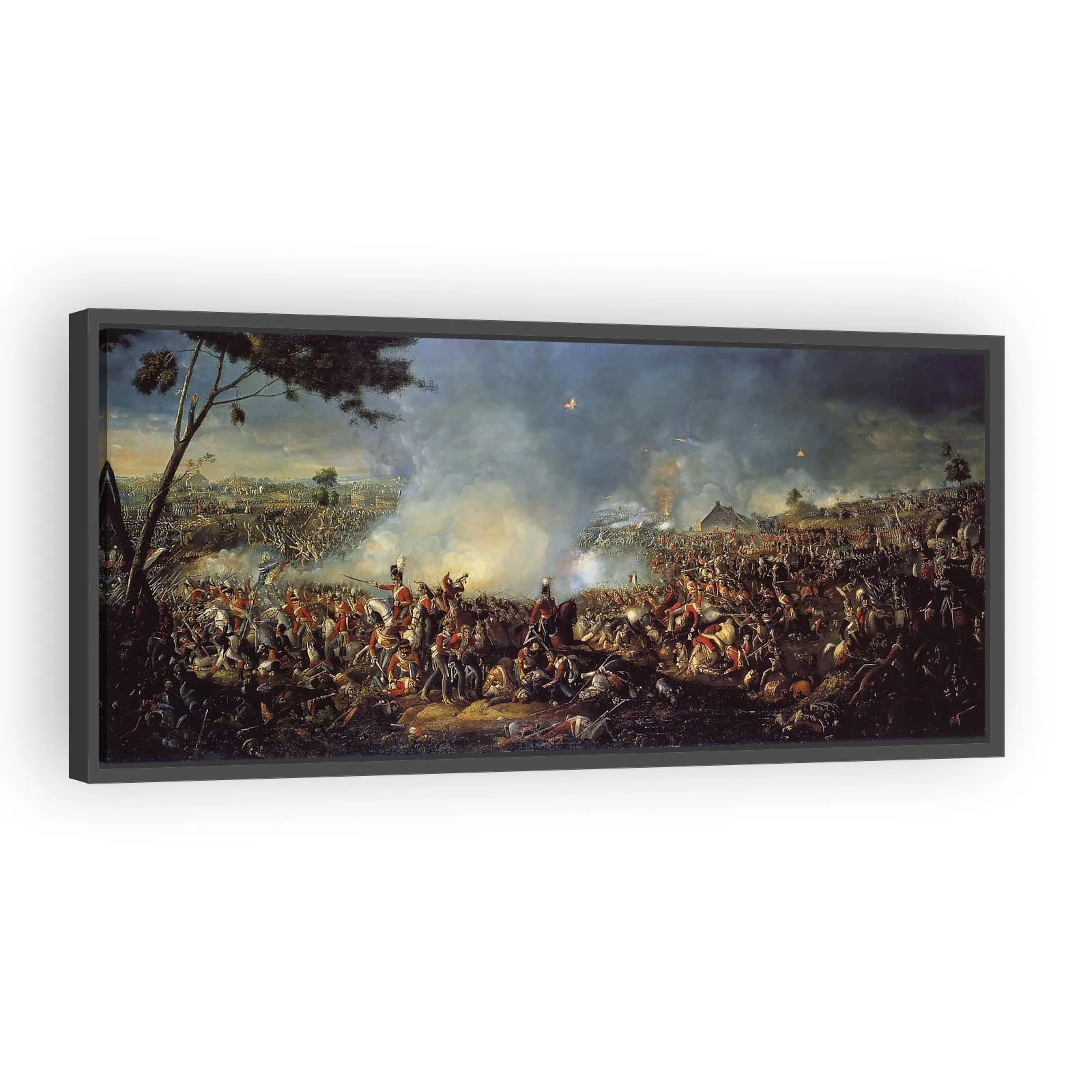 A dramatic 1815 depiction of the decisive Battle of Waterloo by William Sadler, rendered with sweeping movement, vivid contrasts, and detailed military costumes—an evocative historical scene for colle...