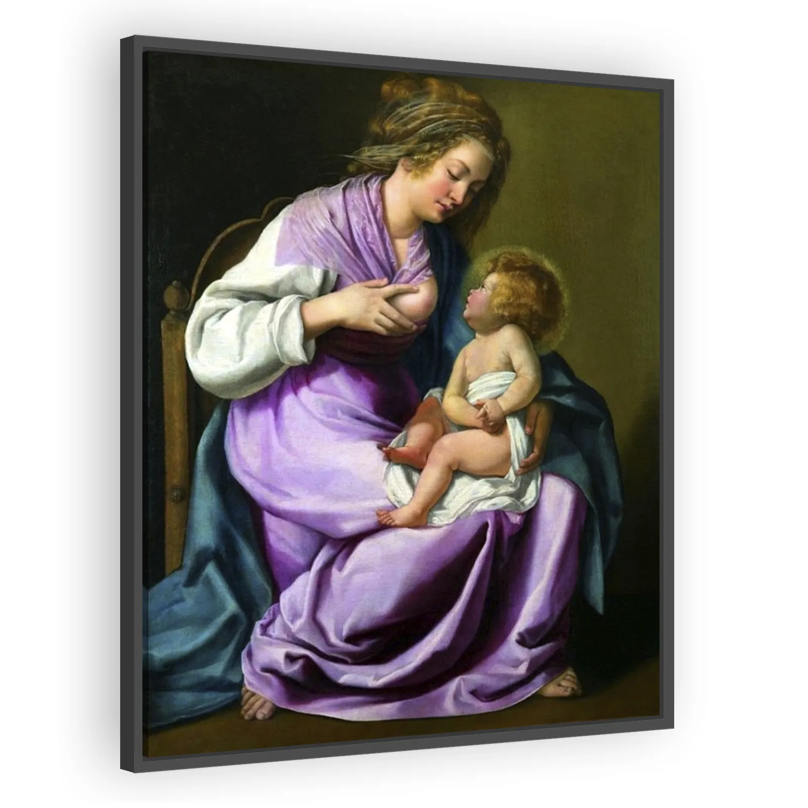 A luminous early Baroque depiction by Artemisia Gentileschi (1617). This intimate, naturalistic rendering of the Madonna and Child showcases Caravaggesque chiaroscuro, emotional realism, and the artis...
